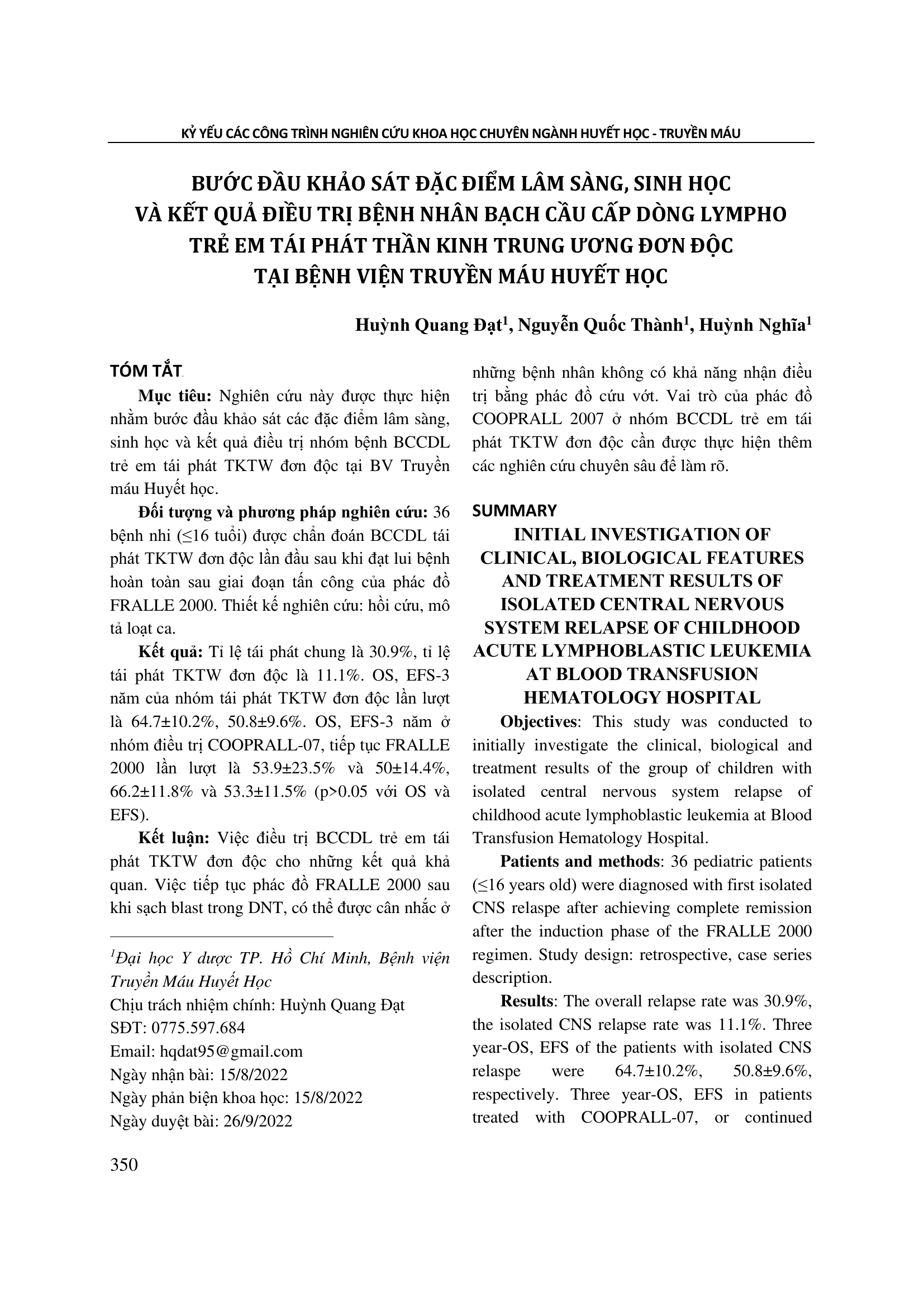 Nghiên cứu này được thực hiện nhằm bước đầu khảo sát các đặc điểm lâm sàng, sinh học và kết quả điều trị nhóm bệnh BCCDL trẻ em tái phát TKTW đơn độc tại BV Truyền máu Huyết học. Đối tượng và phương pháp nghiên cứu: 36 bệnh nhi (≤16 tuổi) được chẩn đoán BCCDL tái phát TKTW đơn độc lần đầu sau khi đạt lui bệnh hoàn toàn sau giai đoạn tấn công của phác đồ FRALLE 2000. Thiết kế nghiên cứu: hồi cứu, mô tả loạt ca. Kết quả: Tỉ lệ tái phát chung là 30.9%, tỉ lệ tái phát TKTW đơn độc là 11.1%. OS, EFS-3 năm của nhóm tái phát TKTW đơn độc lần lượt là 64.7±10.2%, 50.8±9.6%. OS, EFS-3 năm ở nhóm điều trị COOPRALL-07, tiếp tục FRALLE 2000 lần lượt là 53.9±23.5% và 50±14.4%, 66.2±11.8% và 53.3±11.5% (p>0.05 với OS và EFS). Kết luận: Việc điều trị BCCDL trẻ em tái phát TKTW đơn độc cho những kết quả khả quan. Việc tiếp tục phác đồ FRALLE 2000 sau khi sạch blast trong DNT, có thể được cân nhắc ở những bệnh nhân không có khả năng nhận điều trị bằng phác đồ cứu vớt. Vai trò của phác đồ COOPRALL 2007 ở nhóm BCCDL trẻ em tái phát TKTW đơn độc cần được thực hiện thêm các nghiên cứu chuyên sâu để làm rõ.