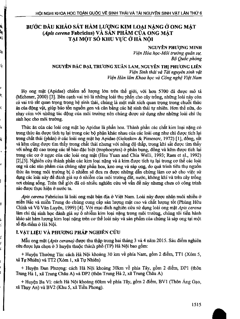 Bước đầu khảo sát hàm lượng kim loại nặng ở ong mật (Apis cerena Fabricius) và sản phẩm của ong mật tại một số khu vực ở Hà Nội