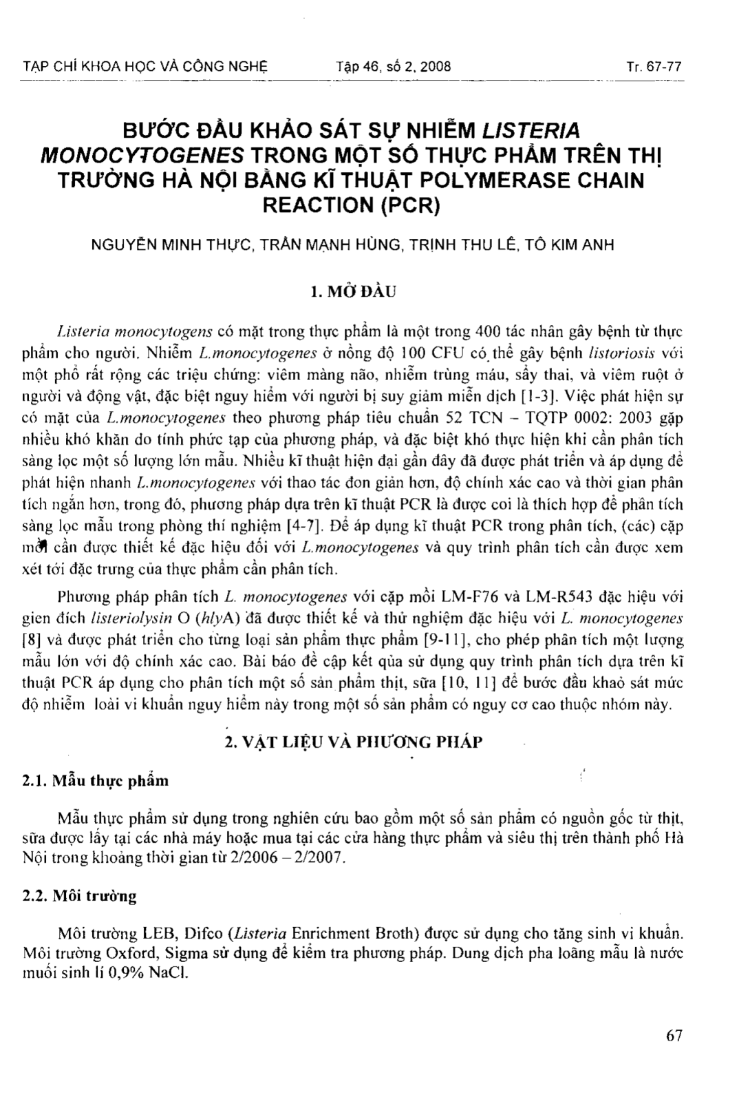 Bước đầu khảo sát sự nhiễm Listeria Monocytogenes trong một số thực phẩm trên thị trường Hà Nội bằng kỹ thuật Polymerase chain reaction (PCR)