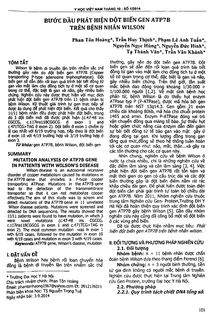 Bước đầu phát hiện đột biến gen ATP7B trên bệnh nhân Wilson