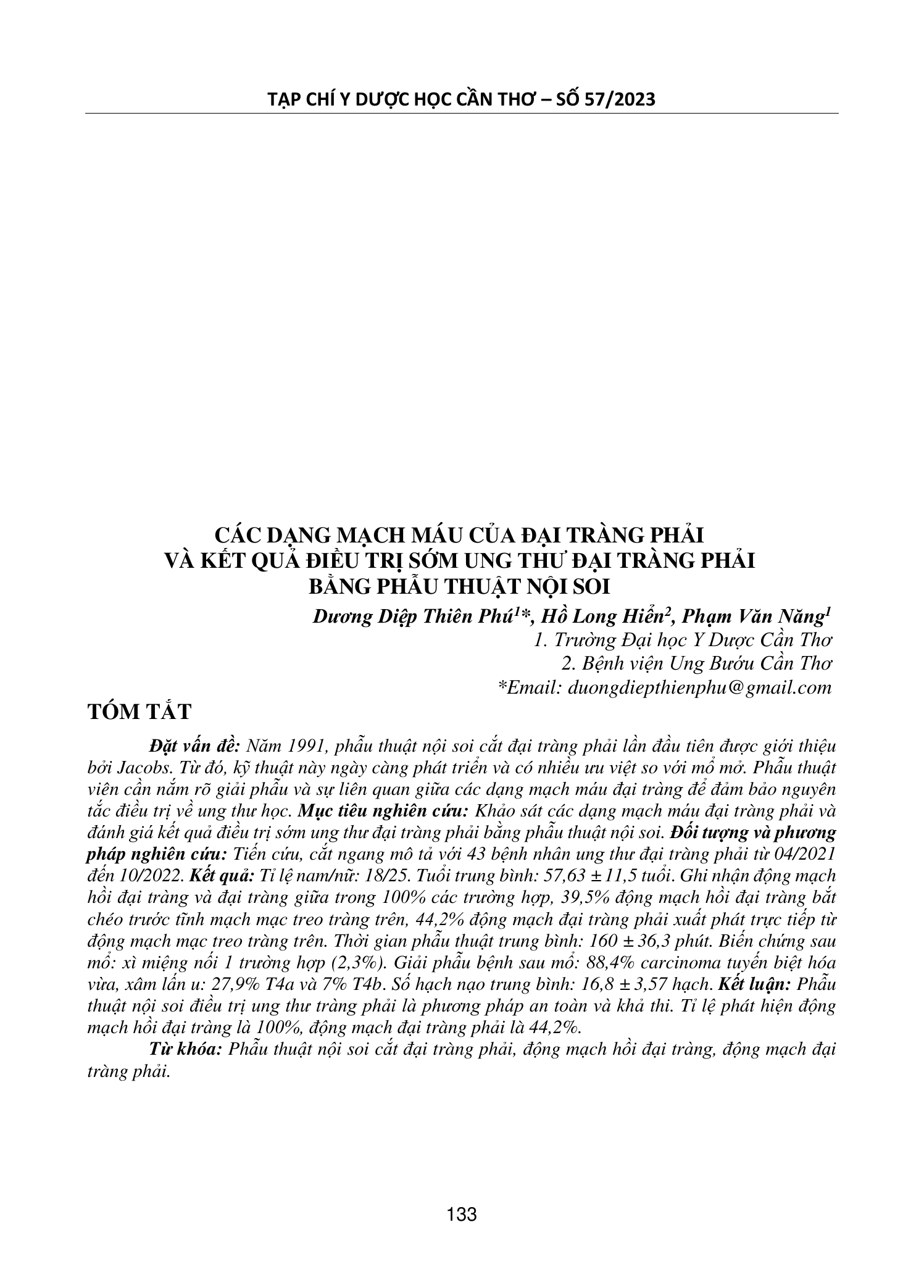 Khảo sát các dạng mạch máu đại tràng phải và đánh giá kết quả điều trị sớm ung thư đại tràng phải bằng phẫu thuật nội soi. Đối tượng và phương pháp nghiên cứu: Tiến cứu, cắt ngang mô tả với 43 bệnh nhân ung thư đại tràng phải từ 04/2021 đến 10/2022. Kết quả: Tỉ lệ nam/nữ: 18/25. Tuổi trung bình: 57,63 ± 11,5 tuổi. Ghi nhận động mạch hồi đại tràng và đại tràng giữa trong 100% các trường hợp, 39,5% động mạch hồi đại tràng bắt chéo trước tĩnh mạch mạc treo tràng trên, 44,2% động mạch đại tràng phải xuất phát trực tiếp từ động mạch mạc treo tràng trên. Thời gian phẫu thuật trung bình: 160 ± 36,3 phút. Biến chứng sau mổ: xì miệng nối 1 trường hợp (2,3%). Giải phẫu bệnh sau mổ: 88,4% carcinoma tuyến biệt hóa vừa, xâm lấn u: 27,9% T4a và 7% T4b. Số hạch nạo trung bình: 16,8 ± 3,57 hạch. Kết luận: Phẫu thuật nội soi điều trị ung thư tràng phải là phương pháp an toàn và khả thi. Tỉ lệ phát hiện động mạch hồi đại tràng là 100%, động mạch đại tràng phải là 44,2%.