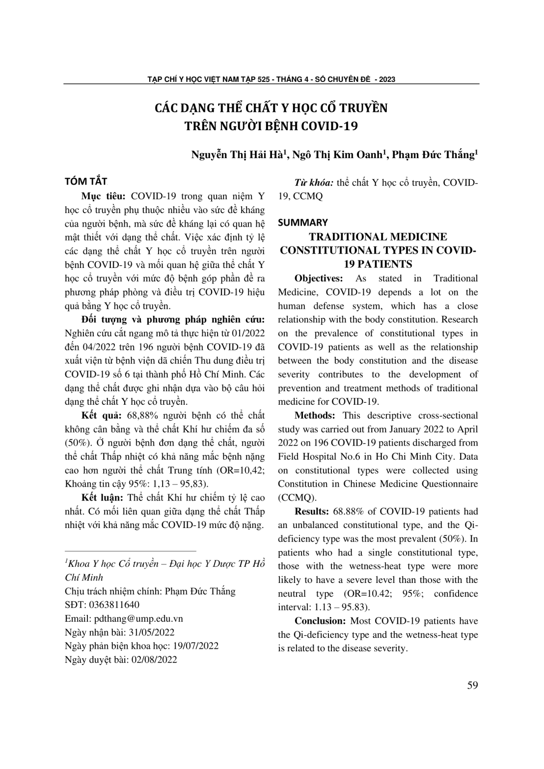COVID-19 trong quan niệm Y học cổ truyền phụ thuộc nhiều vào sức đề kháng của người bệnh, mà sức đề kháng lại có quan hệ mật thiết với dạng thể chất. Việc xác định tỷ lệ các dạng thể chất Y học cổ truyền trên người bệnh COVID-19 và mối quan hệ giữa thể chất Y học cổ truyền với mức độ bệnh góp phần đề ra phương pháp phòng và điều trị COVID-19 hiệu quả bằng Y học cổ truyền. Nghiên cứu cắt ngang mô tả thực hiện từ 01/2022 đến 04/2022 trên 196 người bệnh COVID-19 đã xuất viện từ bệnh viện dã chiến Thu dung điều trị COVID-19 số 6 tại thành phố Hồ Chí Minh. Các dạng thể chất được ghi nhận dựa vào bộ câu hỏi dạng thể chất Y học cổ truyền. 68,88% người bệnh có thể chất không cân bằng và thể chất Khí hư chiếm đa số (50%). Ở người bệnh đơn dạng thể chất, người thể chất Thấp nhiệt có khả năng mắc bệnh nặng cao hơn người thể chất Trung tính (OR=10,42; Khoảng tin cậy 95%: 1,13 – 95,83). Thể chất Khí hư chiếm tỷ lệ cao nhất. Có mối liên quan giữa dạng thể chất Thấp nhiệt với khả năng mắc COVID-19 mức độ nặng.