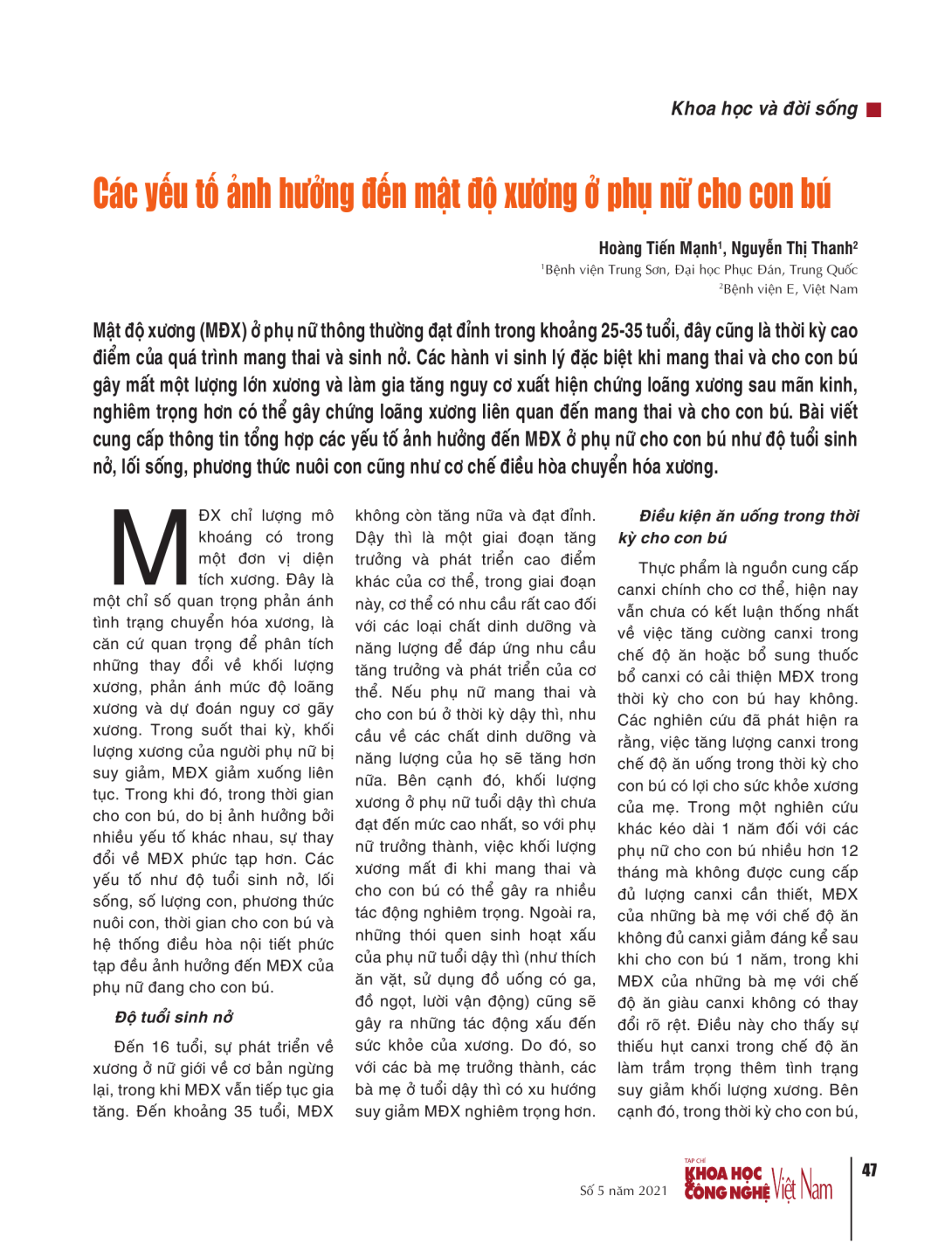 Mật độ xương (MĐX) ở phụ nữ thông thường đạt đỉnh trong khoảng 25-35 tuổi, đây cũng là thời kỳ cao điểm của quá trình mang thai và sinh nở. Các hành vi sinh lý đặc biệt khi mang thai và cho con bú gây mất một lượng lớn xương và làm gia tăng nguy cơ xuất hiện chứng loãng xương sau mãn kinh, nghiêm trọng hơn có thể gây chứng loãng xương liên quan đến mang thai và cho con bú. Bài viết cung cấp thông tin tổng hợp các yếu tố ảnh hưởng đến MĐX ở phụ nữ cho con bú như độ tuổi sinh nở, lối sống, phương thức nuôi con cũng như cơ chế điều hòa chuyển hóa xương.