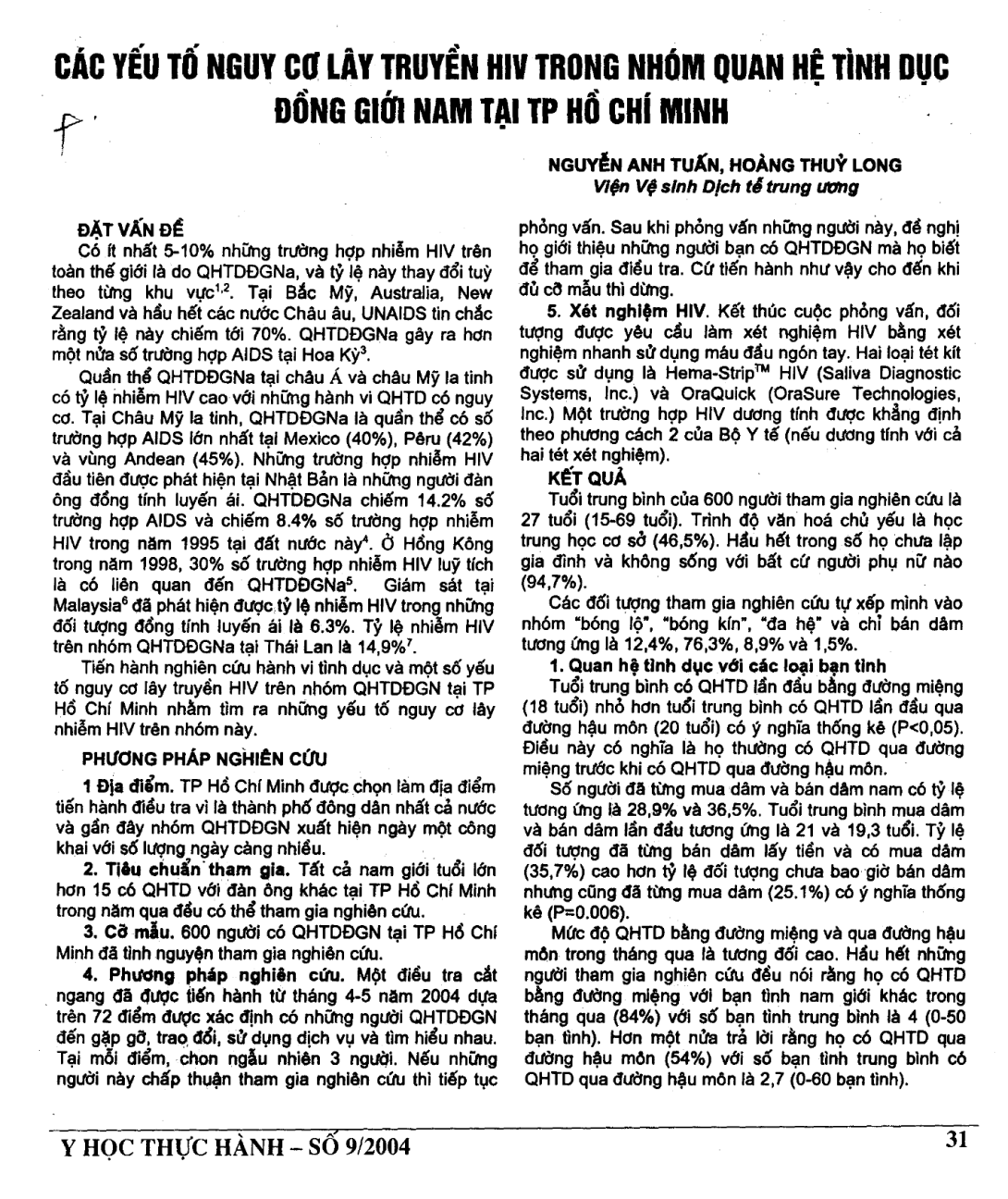 Các yếu tố nguy cơ lây truyền HIV trong nhóm quan hệ tình dục đồng giới nam tại TP Hồ Chí Minh