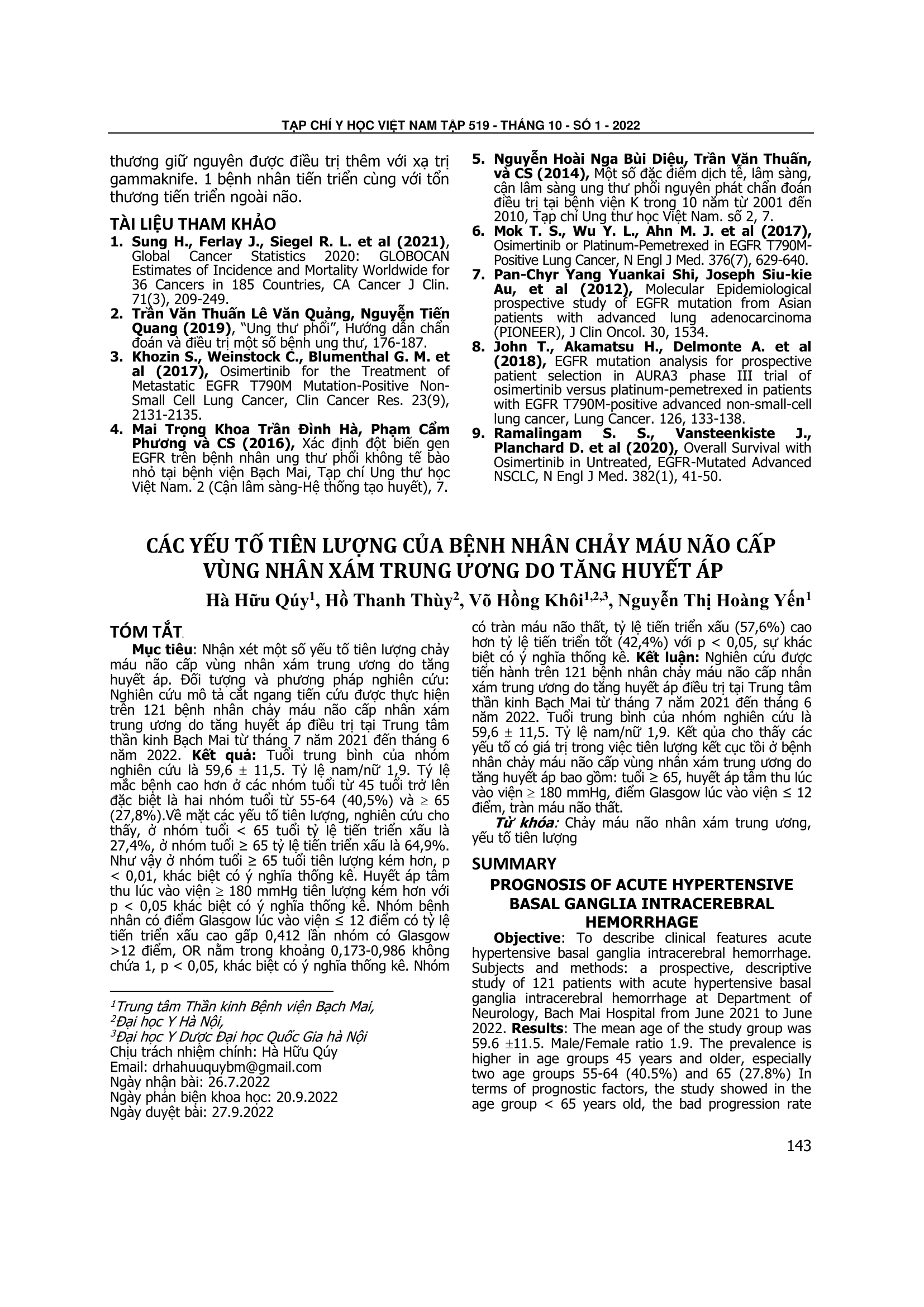 Nhận xét một số yếu tố tiên lượng chảy máu não cấp vùng nhân xám trung ương do tăng huyết áp. Đối tượng và phương pháp nghiên cứu: Nghiên cứu mô tả cắt ngang tiến cứu được thực hiện trên 121 bệnh nhân chảy máu não cấp nhân xám trung ương do tăng huyết áp điều trị tại Trung tâm thần kinh Bạch Mai từ tháng 7 năm 2021 đến tháng 6 năm 2022. Kết quả: Tuổi trung bình của nhóm nghiên cứu là 59,6 11,5. Tỷ lệ nam/nữ 1,9. Tý lệ mắc bệnh cao hơn ở các nhóm tuổi từ 45 tuổi trở lên đặc biệt là hai nhóm tuổi từ 55-64 (40,5%) và 65 (27,8%).Về mặt các yếu tố tiên lượng, nghiên cứu cho thấy, ở nhóm tuổi < 65 tuổi tỷ lệ tiến triển xấu là 27,4%, ở nhóm tuổi ≥ 65 tỷ lệ tiến triển xấu là 64,9%. Như vậy ở nhóm tuổi ≥ 65 tuổi tiên lượng kém hơn, p < 0,01, khác biệt có ý nghĩa thống kê. Huyết áp tâm thu lúc vào viện 180 mmHg tiên lượng kém hơn với p < 0,05 khác biệt có ý nghĩa thống kê. Nhóm bệnh nhân có điểm Glasgow lúc vào viện ≤ 12 điểm có tỷ lệ tiến triển xấu cao gấp 0,412 lần nhóm có Glasgow >12 điểm, OR nằm trong khoảng 0,173-0,986 không chứa 1, p < 0,05, khác biệt có ý nghĩa thống kê. Nhóm có tràn máu não thất, tỷ lệ tiến triển xấu (57,6%) cao hơn tỷ lệ tiến triển tốt (42,4%) với p < 0,05, sự khác biệt có ý nghĩa thống kê. Kết luận: Nghiên cứu được tiến hành trên 121 bệnh nhân chảy máu não cấp nhân xám trung ương do tăng huyết áp điều trị tại Trung tâm thần kinh Bạch Mai từ tháng 7 năm 2021 đến tháng 6 năm 2022. Tuổi trung bình của nhóm nghiên cứu là 59,6 11,5. Tỷ lệ nam/nữ 1,9. Kết qủa cho thấy các yếu tố có giá trị trong việc tiên lượng kết cục tồi ở bệnh nhân chảy máu não cấp vùng nhân xám trung ương do tăng huyết áp bao gồm: tuổi ≥ 65, huyết áp tâm thu lúc vào viện 180 mmHg, điểm Glasgow lúc vào viện ≤ 12 điểm, tràn máu não thất.