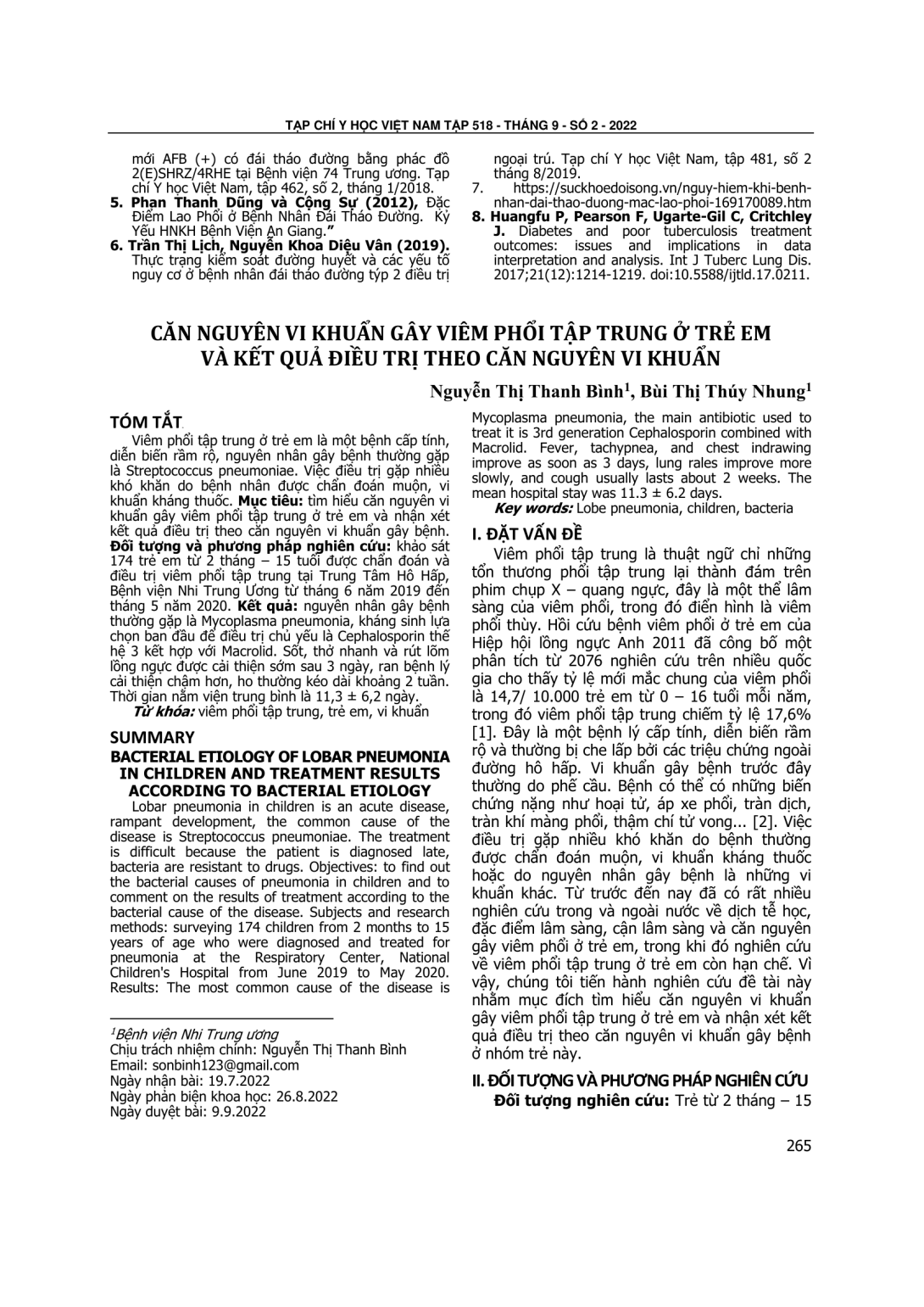 Viêm phổi tập trung ở trẻ em là một bệnh cấp tính, diễn biến rầm rộ, nguyên nhân gây bệnh thường gặp là Streptococcus pneumoniae. Việc điều trị gặp nhiều khó khăn do bệnh nhân được chẩn đoán muộn, vi khuẩn kháng thuốc. Mục tiêu: tìm hiểu căn nguyên vi khuẩn gây viêm phổi tập trung ở trẻ em và nhận xét kết quả điều trị theo căn nguyên vi khuẩn gây bệnh. Đối tượng và phương pháp nghiên cứu: khảo sát 174 trẻ em từ 2 tháng – 15 tuổi được chẩn đoán và điều trị viêm phổi tập trung tại Trung Tâm Hô Hấp, Bệnh viện Nhi Trung Ương từ tháng 6 năm 2019 đến tháng 5 năm 2020. Kết quả: nguyên nhân gây bệnh thường gặp là Mycoplasma pneumonia, kháng sinh lựa chọn ban đầu để điều trị chủ yếu là Cephalosporin thế hệ 3 kết hợp với Macrolid. Sốt, thở nhanh và rút lõm lồng ngực được cải thiện sớm sau 3 ngày, ran bệnh lý cải thiện chậm hơn, ho thường kéo dài khoảng 2 tuần. Thời gian nằm viện trung bình là 11,3 ± 6,2 ngày
