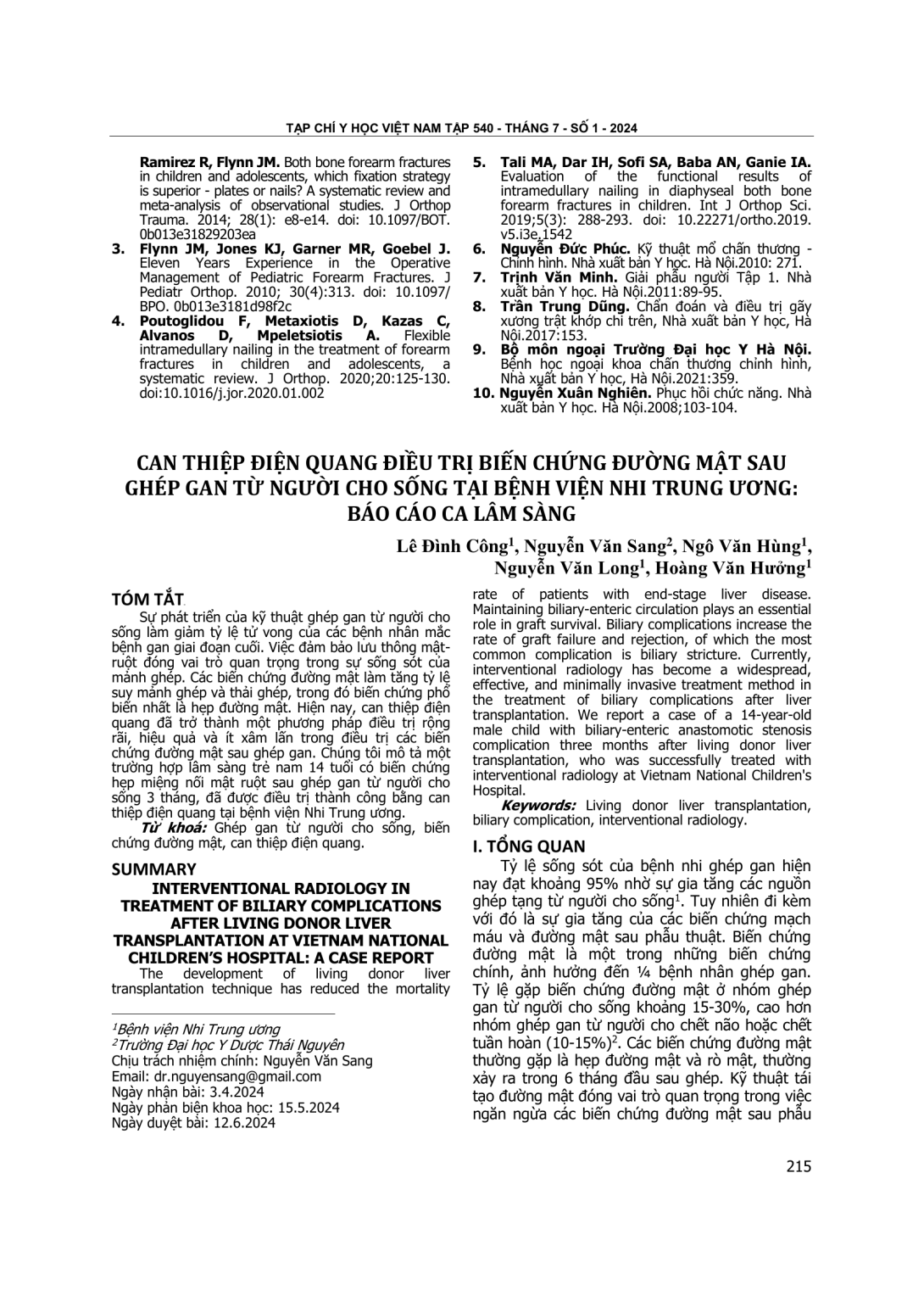 Sự phát triển của kỹ thuật ghép gan từ người cho sống làm giảm tỷ lệ tử vong của các bệnh nhân mắc bệnh gan giai đoạn cuối. Việc đảm bảo lưu thông mật-ruột đóng vai trò quan trọng trong sự sống sót của mảnh ghép. Các biến chứng đường mật làm tăng tỷ lệ suy mảnh ghép và thải ghép, trong đó biến chứng phổ biến nhất là hẹp đường mật. Hiện nay, can thiệp điện quang đã trở thành một phương pháp điều trị rộng rãi, hiệu quả và ít xâm lấn trong điều trị các biến chứng đường mật sau ghép gan. Chúng tôi mô tả một trường hợp lâm sàng trẻ nam 14 tuổi có biến chứng hẹp miệng nối mật ruột sau ghép gan từ người cho sống 3 tháng, đã được điều trị thành công bằng can thiệp điện quang tại bệnh viện Nhi Trung ương.