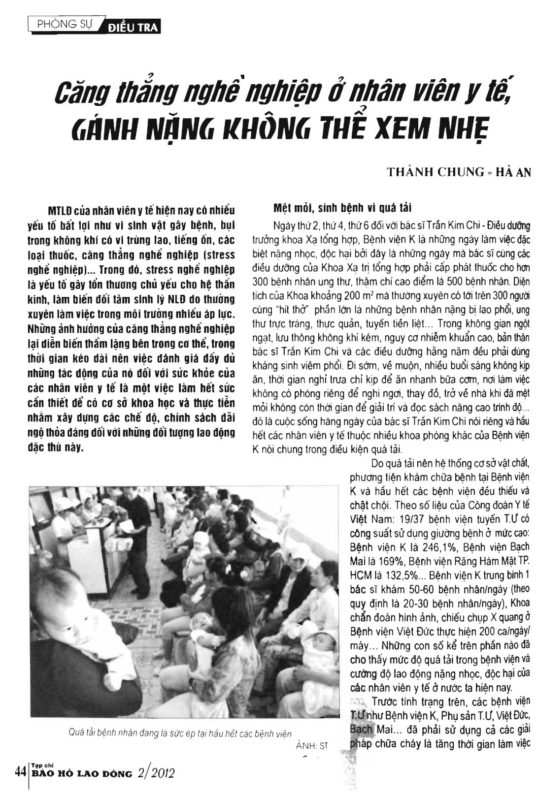 Working environment of health care workers today have many adverse factors such as microbial pathogens, noise, drugs and occupational stress... In which occupational stress is a factor causing injury to the nervous system primarily, altering physiological workers. Therefore, studies are needed to build policies and regimes suitable for workers in the health sector.