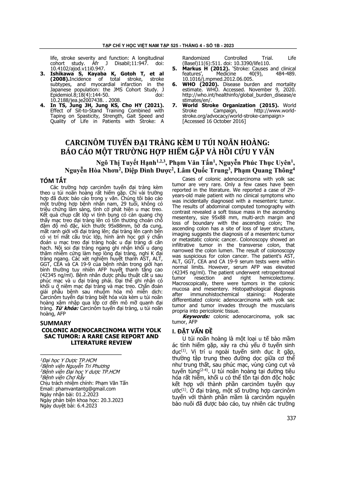 Các trường hợp carcinôm tuyến đại tràng kèm theo u túi noãn hoàng rất hiếm gặp. Chỉ vài trường hợp đã được báo cáo trong y văn. Chúng tôi báo cáo một trường hợp bệnh nhân nam, 29 tuổi, không có triệu chứng lâm sàng, tình cờ phát hiện u mạc treo. Kết quả chụp cắt lớp vi tính bụng có cản quang cho thấy mạc treo đại tràng lên có tổn thương choán chỗ đậm độ mô đặc, kích thước 95x88mm, bờ đa cung, mất ranh giới với đại tràng lên; đại tràng lên cạnh bên có vị trí mất cấu trúc lớp, hình ảnh học gợi ý chẩn đoán u mạc treo đại tràng hoặc u đại tràng di căn hạch. Nội soi đại tràng ngang ghi nhận khối u dạng thâm nhiễm cứng làm hẹp lòng đại tràng, nghi K đại tràng ngang. Các xét nghiệm huyết thanh AST, ALT, GGT, CEA và CA 19-9 của bệnh nhân trong giới hạn bình thường tuy nhiên AFP huyết thanh tăng cao (42345 ng/ml). Bệnh nhân được phẫu thuật cắt u sau phúc mạc và u đại tràng phải. Đại thể ghi nhận có khối u ở niêm mạc đại tràng và mạc treo. Chẩn đoán giải phẫu bệnh sau nhuộm hóa mô miễn dịch: Carcinôm tuyến đại tràng biệt hóa vừa kèm u túi noãn hoàng xâm nhập qua lớp cơ đến mô mỡ quanh đại tràng.