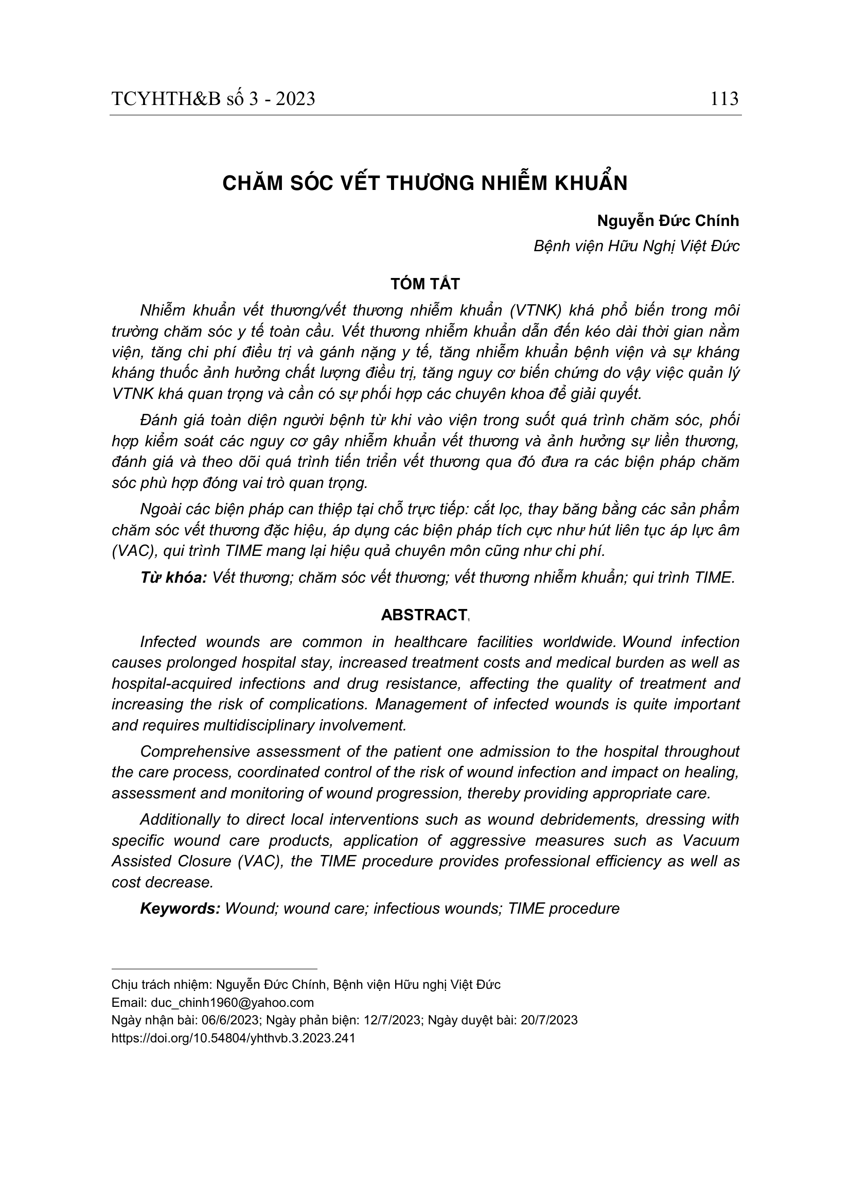 Nhiễm khuẩn vết thương/vết thương nhiễm khuẩn (VTNK) khá phổ biến trong môi trường chăm sóc y tế toàn cầu. Vết thương nhiễm khuẩn dẫn đến kéo dài thời gian nằm viện, tăng chi phí điều trị và gánh nặng y tế, tăng nhiễm khuẩn bệnh viện và sự kháng kháng thuốc ảnh hưởng chất lượng điều trị, tăng nguy cơ biến chứng do vậy việc quản lý VTNK khá quan trọng và cần có sự phối hợp các chuyên khoa để giải quyết. Đánh giá toàn diện người bệnh từ khi vào viện trong suốt quá trình chăm sóc, phối hợp kiểm soát các nguy cơ gây nhiễm khuẩn vết thương và ảnh hưởng sự liền thương, đánh giá và theo dõi quá trình tiến triển vết thương qua đó đưa ra các biện pháp chăm sóc phù hợp đóng vai trò quan trọng. Ngoài các biện pháp can thiệp tại chỗ trực tiếp: cắt lọc, thay băng bằng các sản phẩm chăm sóc vết thương đặc hiệu, áp dụng các biện pháp tích cực như hút liên tục áp lực âm (VAC), qui trình TIME mang lại hiệu quả chuyên môn cũng như chi phí.