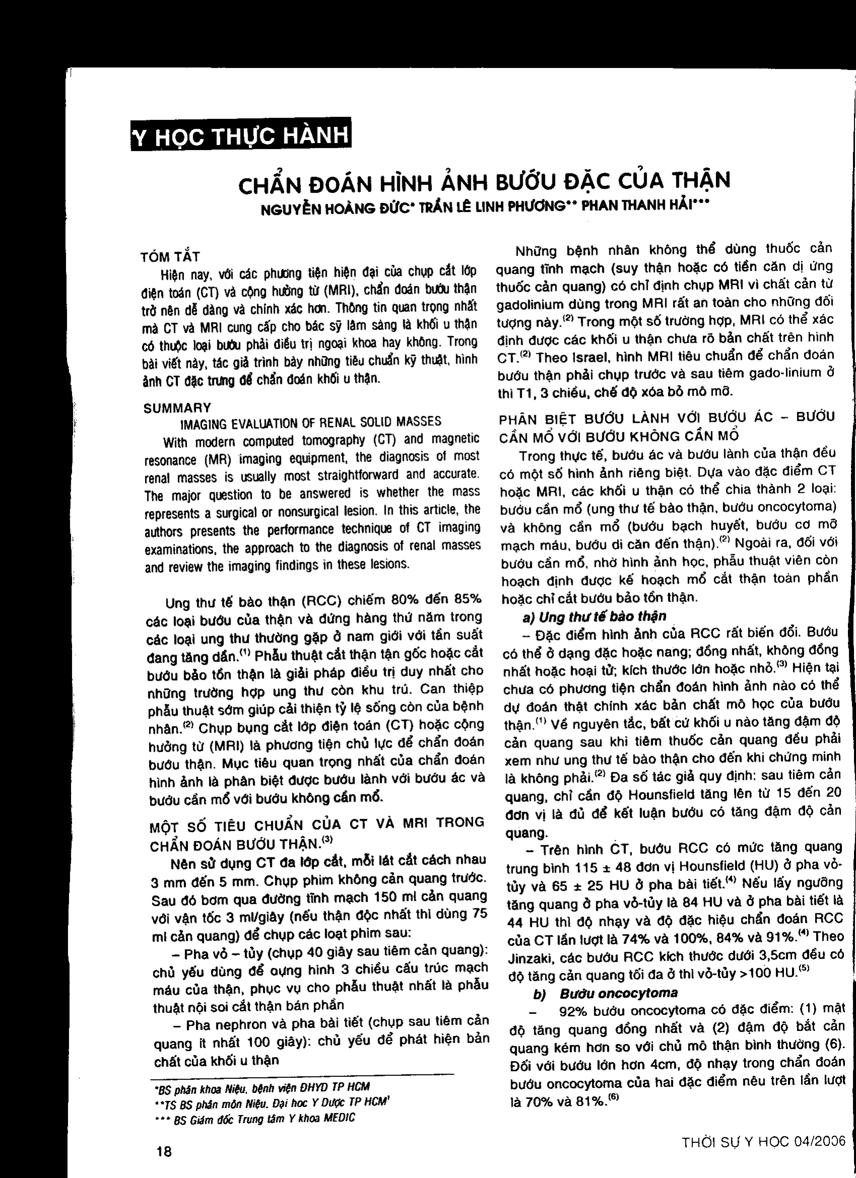 Hiện nay, với các phương tiện hiện đại của chụp cắt lớp điện toán và cộng hưởng từ, chẩn đoán bướu thận trở nên dễ dàng và chính xác hơn. Phương pháp này cung cấp cho bác sĩ lâm sàng là khối u thận có thuộc loại bướu phải điều trị ngoại khoa hay ko. Trong bài viết này, tác giả trình bày những tiêu chẩn kỹ thuật, hình ảnh CT đặc trưng để chẩn đoán khối u thận.