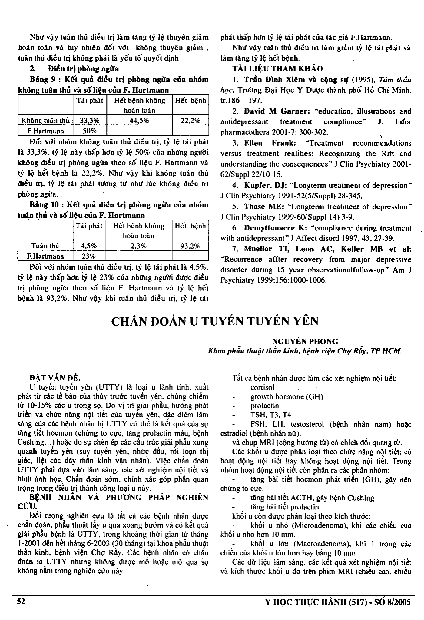 Nghiên cứu trên 91 bệnh nhân, tuổi từ 14 đến 74, trong đó 45 là nữ, 56 là nam. Kết quả nghiên cứu cho phép kết luận rằng, để chẩn đoám u tuyến tuyến yên (UTTY) cần nắm được các đặc điểm lâm sàng, nhất là các triệu chứng rối loạn nội tiết. Cần thực hiện các xét nghiệm nội tiết để chẩn đoán sớm, có phương thức điều trị thích hợp. Chụp MRI là phương tiện chẩn đoán hình ảnh tốt nhất hiện nay trong điều kiện ở Việt Nam.