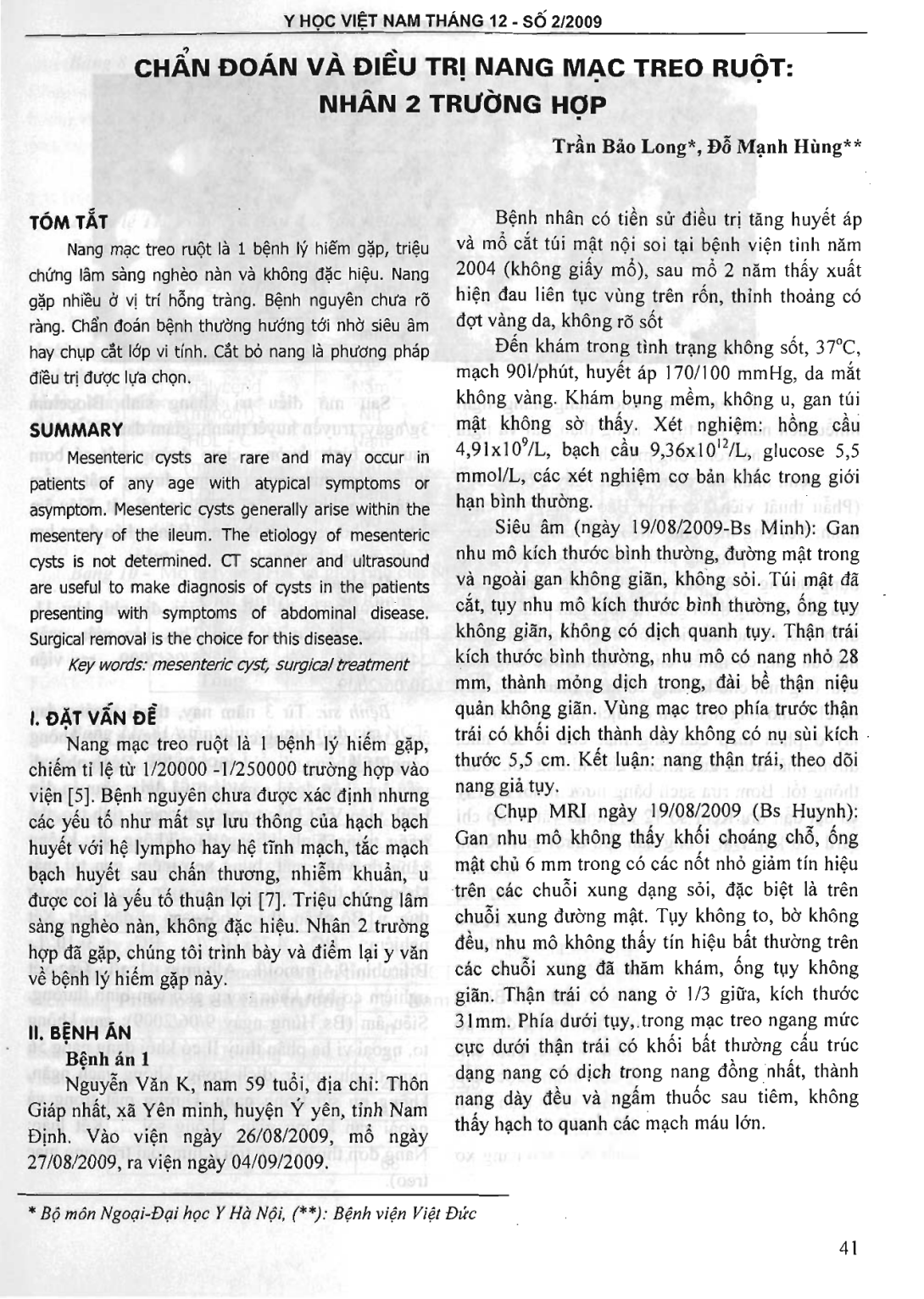 Chẩn đoán và điều trị nang mạc treo ruột nhân 2 trường hợp