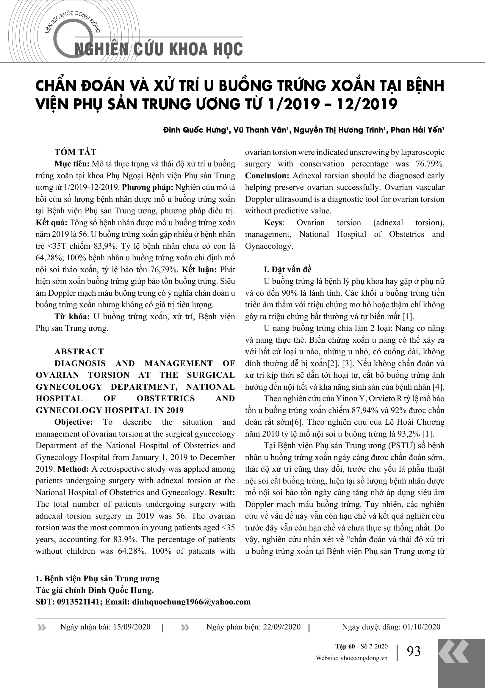 Chẩn đoán và xử trí u buồng trứng xoắn tại Bệnh viện Phụ sản Trung ương từ 1/2019 – 12/2019