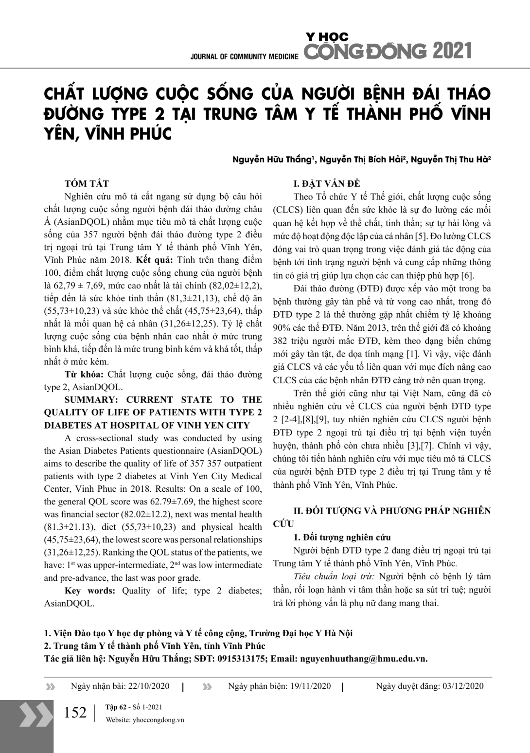Nghiên cứu mô tả cắt ngang sử dụng bộ câu hỏi chất lượng cuộc sống người bệnh đái tháo đường châu Á (AsianDQOL) nhằm mục tiêu mô tả chất lượng cuộc sống của 357 người bệnh đái tháo đường type 2 điều trị ngoại trú tại Trung tâm Y tế thành phố Vĩnh Yên, Vĩnh Phúc năm 2018. Tính trên thang điểm 100, điểm chất lượng cuộc sống chung của người bệnh là 62,79 ± 7,69, mức cao nhất là tài chính (82,02±12,2), tiếp đến là sức khỏe tinh thần (81,3±21,13), chế độ ăn (55,73±10,23) và sức khỏe thể chất (45,75±23,64), thấp nhất là mối quan hệ cá nhân (31,26±12,25). Tỷ lệ chất lượng cuộc sống của bệnh nhân cao nhất ở mức trung bình khá, tiếp đến là mức trung bình kém và khá tốt, thấp nhất ở mức kém.