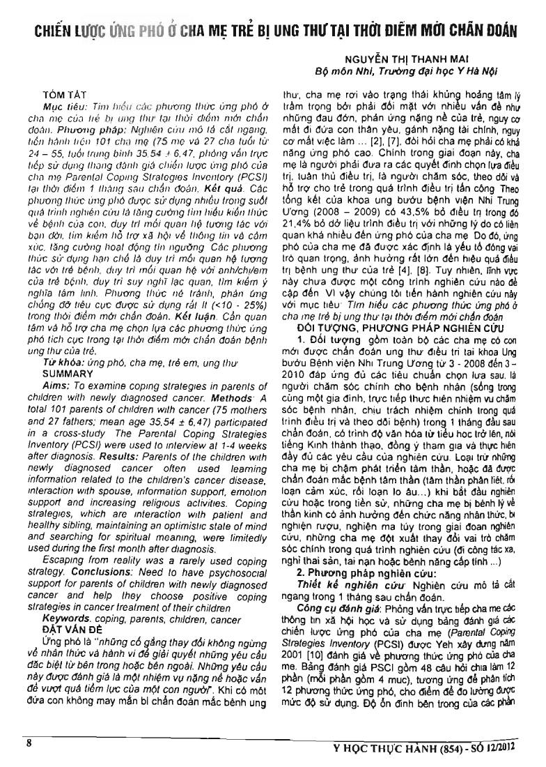 Aims: To examine coping strategies in parents of children with newly diagnosed cancer. Methods: A total 101 parents of children with cancer (75 mothers and 27 fathers; mean age 35.54 + or - 6.47) participated in a cross-study. The Parental Coping Strategies Inventory (PCSI) were used to interview at 1-4 weeks after diagnosis. Results: Parents of the children with newly diagnosed cancer often used learning information related to the children's cancer disease, interaction with spouse, information support, emotion support and increasing religious activities. Coping strategies, which are interaction with patient and healthy sibling, maintaining an optimistic state of mind and searching for spiritual meaning, were limitedly used during the first month after diagnosis. Escaping from reality was a rarely used coping strategy. Conclusions: Need to have psychosocial support for parents of children with newly diagnosed cancer and help they choose positive coping strategies in cancer treatment of their children.