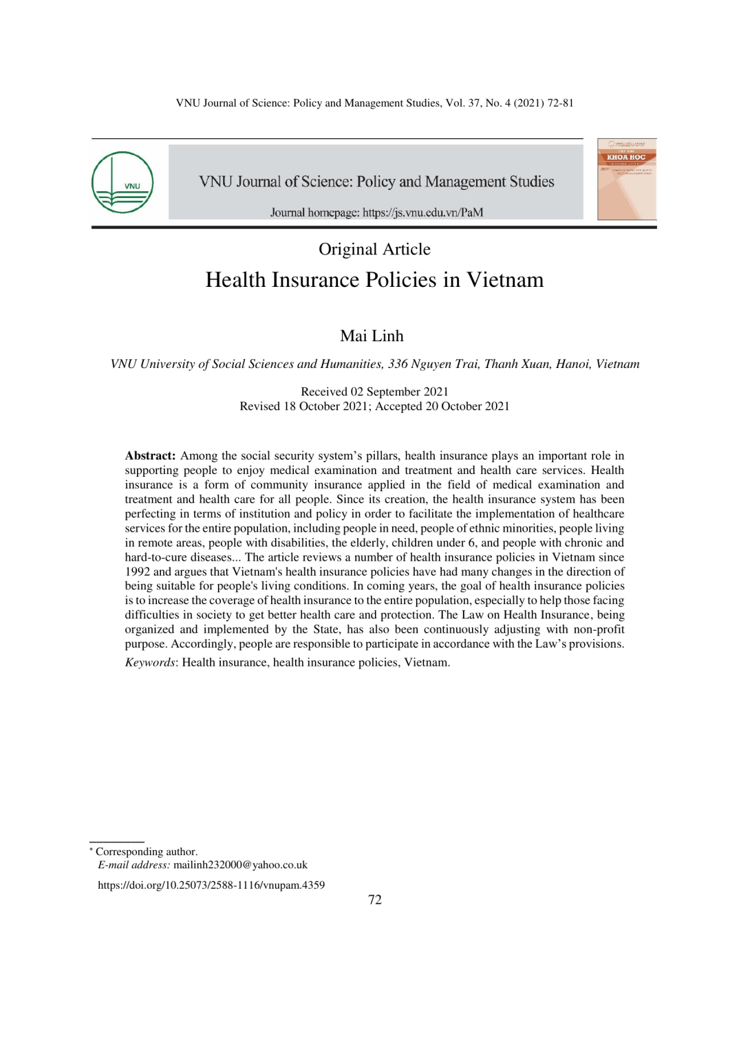 Among the social security system’s pillars, health insurance plays an important role in supporting people to enjoy medical examination and treatment and health care services. Health insurance is a form of community insurance applied in the field of medical examination and treatment and health care for all people. Since its creation, the health insurance system has been perfecting in terms of institution and policy in order to facilitate the implementation of healthcare services for the entire population, including people in need, people of ethnic minorities, people living in remote areas, people with disabilities, the elderly, children under 6, and people with chronic and hard-to-cure diseases... The article reviews a number of health insurance policies in Vietnam since 1992 and argues that Vietnam's health insurance policies have had many changes in the direction of being suitable for people's living conditions. In coming years, the goal of health insurance policies is to increase the coverage of health insurance to the entire population, especially to help those facing difficulties in society to get better health care and protection. The Law on Health Insurance, being organized and implemented by the State, has also been continuously adjusting with non-profit purpose. Accordingly, people are responsible to participate in accordance with the Law’s provisions