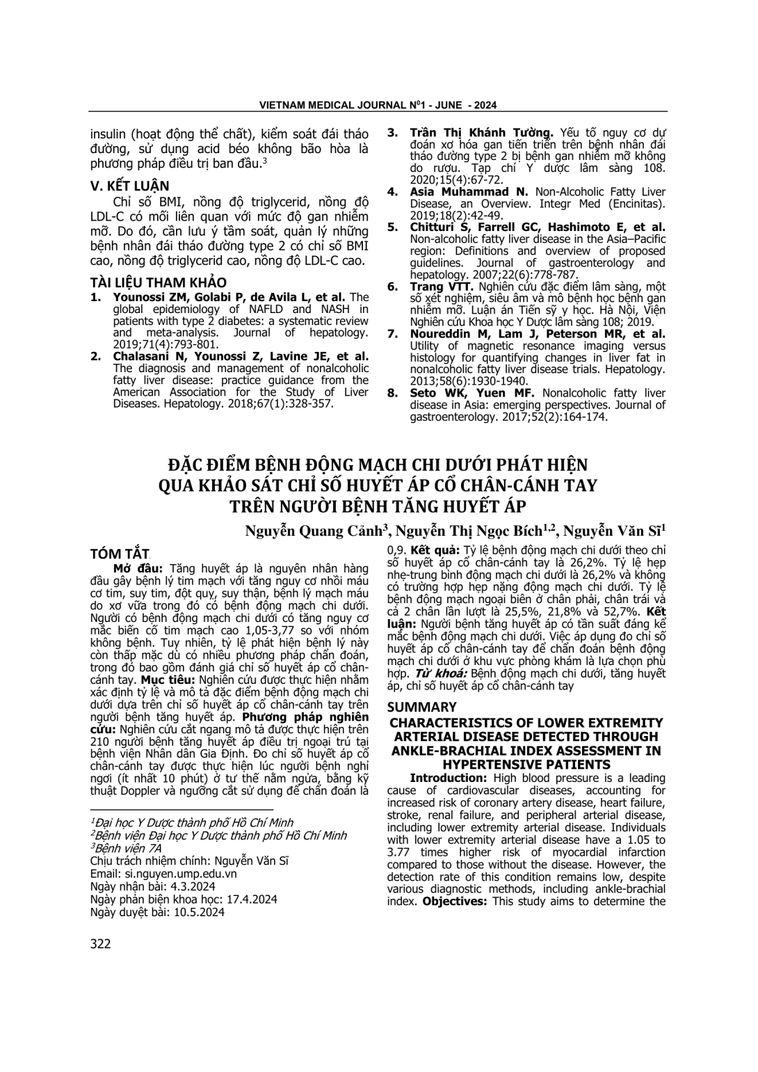 Tăng huyết áp là nguyên nhân hàng đầu gây bệnh lý tim mạch với tăng nguy cơ nhồi máu cơ tim, suy tim, đột quỵ, suy thận, bệnh lý mạch máu do xơ vữa trong đó có bệnh động mạch chi dưới. Người có bệnh động mạch chi dưới có tăng nguy cơ mắc biến cố tim mạch cao 1,05-3,77 so với nhóm không bệnh. Tuy nhiên, tỷ lệ phát hiện bệnh lý này còn thấp mặc dù có nhiều phương pháp chẩn đoán, trong đó bao gồm đánh giá chỉ số huyết áp cổ chân-cánh tay. Mục tiêu: Nghiên cứu được thực hiện nhằm xác định tỷ lệ và mô tả đặc điểm bệnh động mạch chi dưới dựa trên chỉ số huyết áp cổ chân-cánh tay trên người bệnh tăng huyết áp. Phương pháp nghiên cứu: Nghiên cứu cắt ngang mô tả được thực hiện trên 210 người bệnh tăng huyết áp điều trị ngoại trú tại bệnh viện Nhân dân Gia Định. Đo chỉ số huyết áp cổ chân-cánh tay được thực hiện lúc người bệnh nghỉ ngơi (ít nhất 10 phút) ở tư thế nằm ngửa, bằng kỹ thuật Doppler và ngưỡng cắt sử dụng để chẩn đoán là 0,9. Kết quả: Tỷ lệ bệnh động mạch chi dưới theo chỉ số huyết áp cổ chân-cánh tay là 26,2%. Tỷ lệ hẹp nhẹ-trung bình động mạch chi dưới là 26,2% và không có trường hợp hẹp nặng động mạch chi dưới. Tỷ lệ bệnh động mạch ngoại biên ở chân phải, chân trái và cả 2 chân lần lượt là 25,5%, 21,8% và 52,7%. Kết luận: Người bệnh tăng huyết áp có tần suất đáng kể mắc bệnh động mạch chi dưới. Việc áp dụng đo chỉ số huyết áp cổ chân-cánh tay để chẩn đoán bệnh động mạch chi dưới ở khu vực phòng khám là lựa chọn phù hợp.