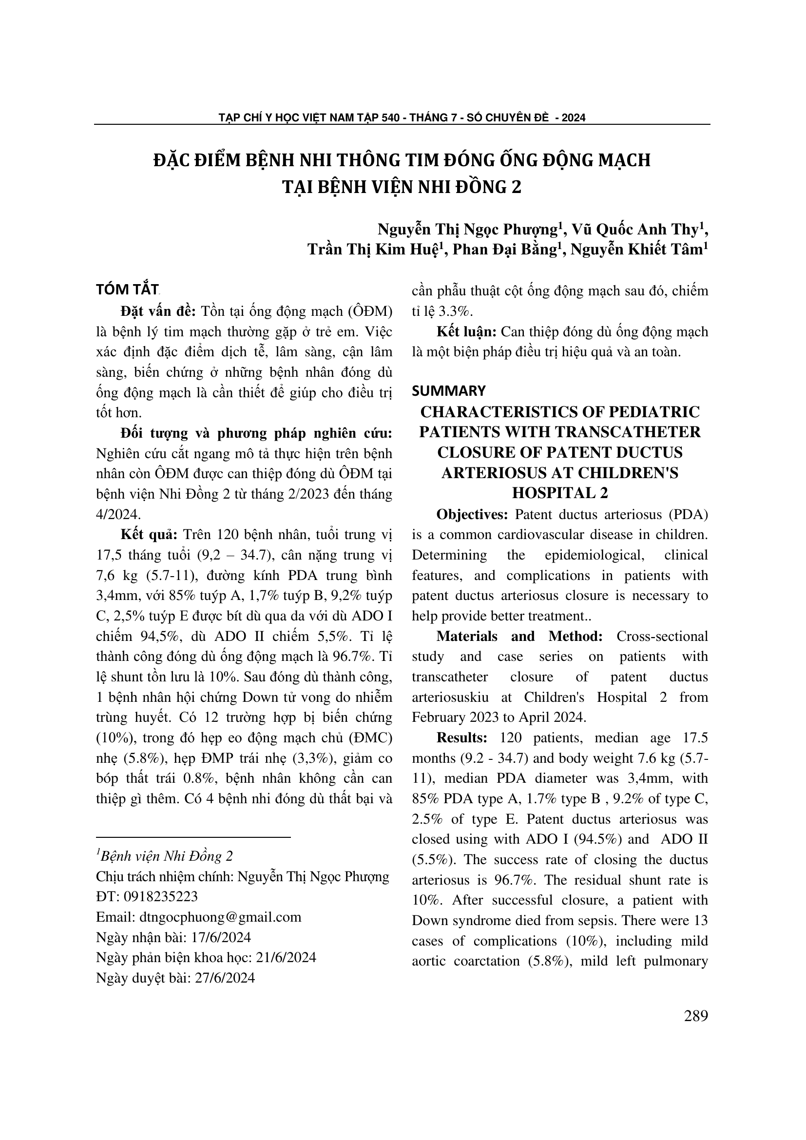 Patent ductus arteriosus (PDA) is a common cardiovascular disease in children. Determining the epidemiological, clinical features, and complications in patients with patent ductus arteriosus closure is necessary to help provide better treatment.. Materials and Method: Cross‐sectional study and case series on patients with transcatheter closure of patent ductus arteriosuskiu at Children's Hospital 2 from February 2023 to April 2024. Results: 120 patients, median age 17.5 months (9.2 - 34.7) and body weight 7.6 kg (5.7-11), median PDA diameter was 3,4mm, with 85% PDA type A, 1.7% type B , 9.2% of type C, 2.5% of type E. Patent ductus arteriosus was closed using with ADO I (94.5%) and ADO II (5.5%). The success rate of closing the ductus arteriosus is 96.7%. The residual shunt rate is 10%. After successful closure, a patient with Down syndrome died from sepsis. There were 13 cases of complications (10%), including mild aortic coarctation (5.8%), mild left pulmonary artery stenosis (3.3%), decreased left ventricular contractility (0.8%), this patients did not need intervention. anything more. There were 4 patients (3,3%) with failed PDA closure and needed surgery. Conclusion: Transcatheter closure of patent ductus arteriosus is an effective and safe treatment.