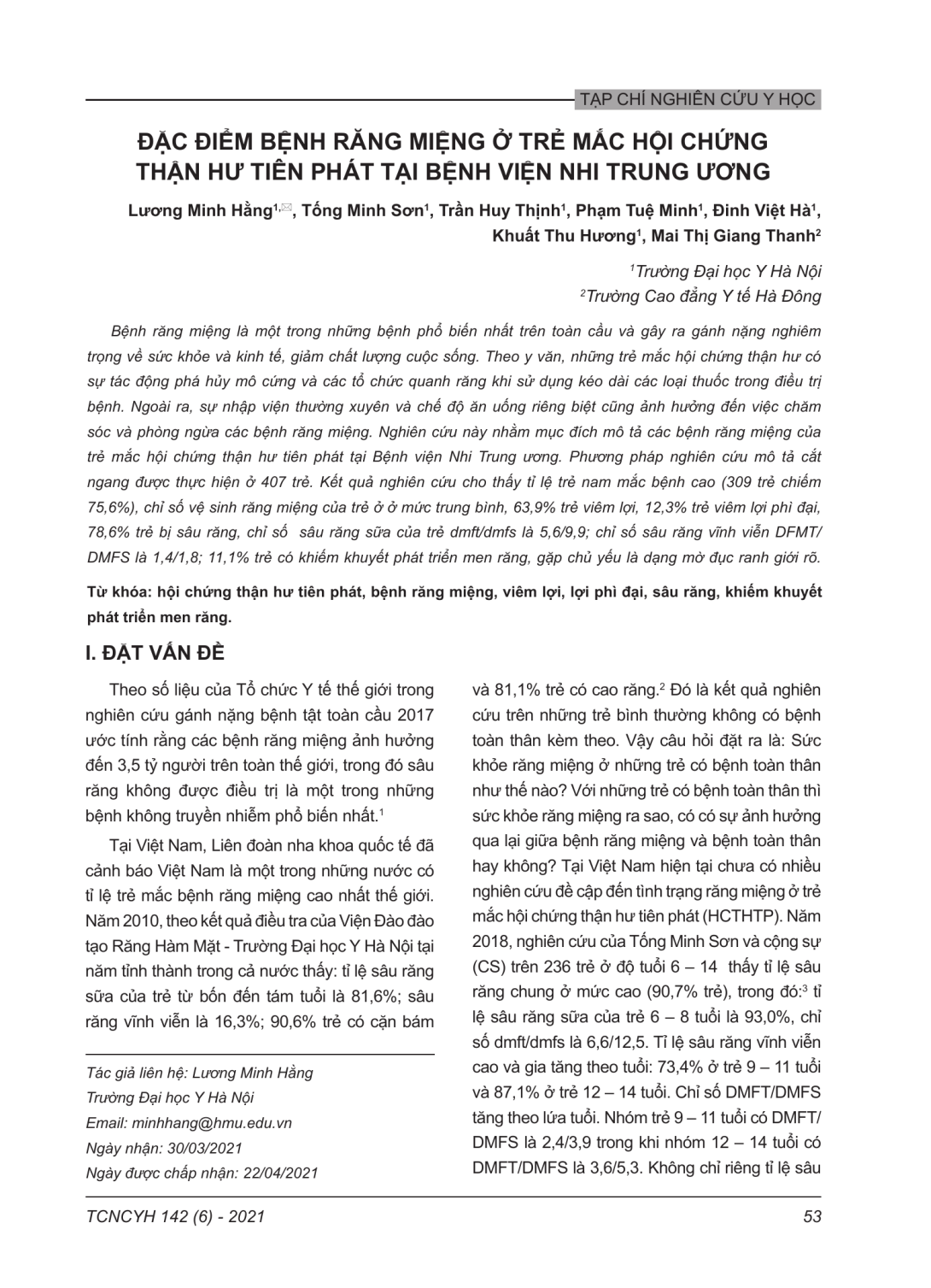 Bệnh răng miệng là một trong những bệnh phổ biến nhất trên toàn cầu và gây ra gánh nặng nghiêm trọng về sức khỏe và kinh tế, giảm chất lượng cuộc sống. Theo y văn, những trẻ mắc hội chứng thận hư có sự tác động phá hủy mô cứng và các tổ chức quanh răng khi sử dụng kéo dài các loại thuốc trong điều trị bệnh. Ngoài ra, sự nhập viện thường xuyên và chế độ ăn uống riêng biệt cũng ảnh hưởng đến việc chăm sóc và phòng ngừa các bệnh răng miệng. Nghiên cứu này nhằm mục đích mô tả các bệnh răng miệng của trẻ mắc hội chứng thận hư tiên phát tại Bệnh viện Nhi Trung ương. Phương pháp nghiên cứu mô tả cắt ngang được thực hiện ở 407 trẻ. Kết quả nghiên cứu cho thấy tỉ lệ trẻ nam mắc bệnh cao (309 trẻ chiếm 75,6%), chỉ số vệ sinh răng miệng của trẻ ở ở mức trung bình, 63,9% trẻ viêm lợi, 12,3% trẻ viêm lợi phì đại, 78,6% trẻ bị sâu răng, chỉ số sâu răng sữa của trẻ dmft/dmfs là 5,6/9,9; chỉ số sâu răng vĩnh viễn DFMT/ DMFS là 1,4/1,8; 11,1% trẻ có khiếm khuyết phát triển men răng, gặp chủ yếu là dạng mờ đục ranh giới rõ.