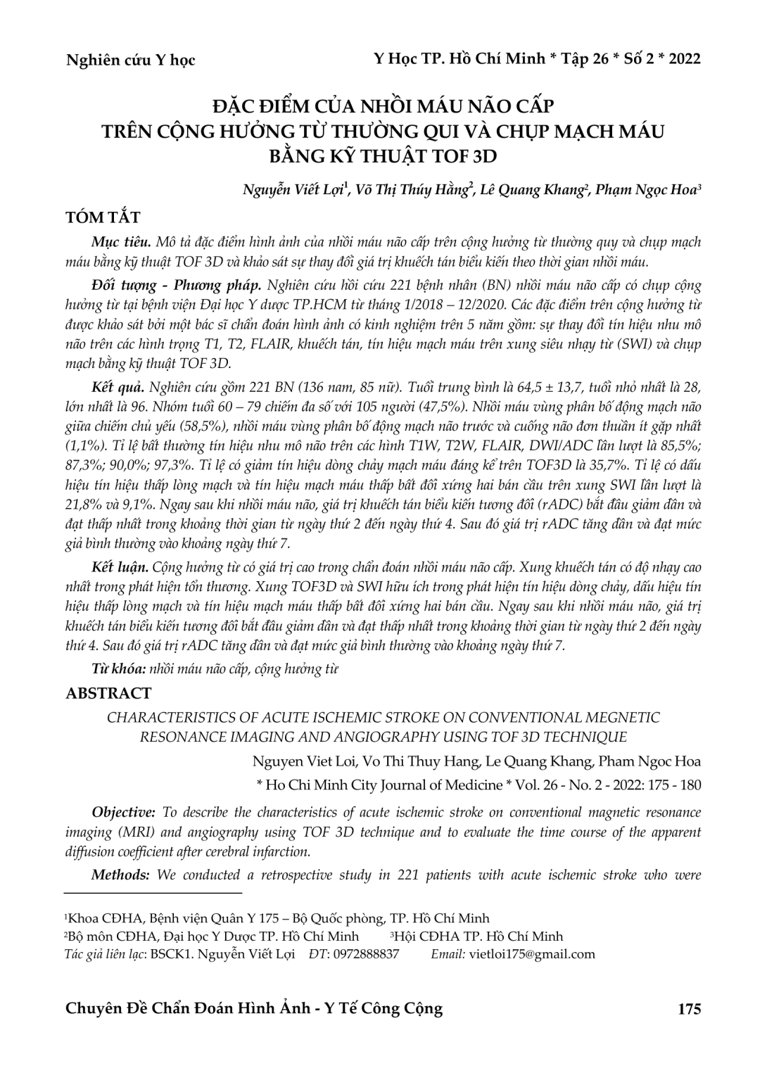 Mô tả đặc điểm hình ảnh của nhồi máu não cấp trên cộng hưởng từ thường quy và chụp mạch máu bằng kỹ thuật TOF 3D và khảo sát sự thay đổi giá trị khuếch tán biểu kiến theo thời gian nhồi máu. Đối tượng - Phương pháp. Nghiên cứu hồi cứu 221 bệnh nhân (BN) nhồi máu não cấp có chụp cộng hưởng từ tại bệnh viện Đại học Y dược TP.HCM từ tháng 1/2018 – 12/2020. Các đặc điểm trên cộng hưởng từ được khảo sát bởi một bác sĩ chẩn đoán hình ảnh có kinh nghiệm trên 5 năm gồm: sự thay đổi tín hiệu nhu mô não trên các hình trọng T1, T2, FLAIR, khuếch tán, tín hiệu mạch máu trên xung siêu nhạy từ (SWI) và chụp mạch bằng kỹ thuật TOF 3D. Kết quả. Nghiên cứu gồm 221 BN (136 nam, 85 nữ). Tuổi trung bình là 64,5 ± 13,7, tuổi nhỏ nhất là 28, lớn nhất là 96. Nhóm tuổi 60 – 79 chiếm đa số với 105 người (47,5%). Nhồi máu vùng phân bố động mạch não giữa chiếm chủ yếu (58,5%), nhồi máu vùng phân bố động mạch não trước và cuống não đơn thuần ít gặp nhất (1,1%). Tỉ lệ bất thường tín hiệu nhu mô não trên các hình T1W, T2W, FLAIR, DWI/ADC lần lượt là 85,5%; 87,3%; 90,0%; 97,3%. Tỉ lệ có giảm tín hiệu dòng chảy mạch máu đáng kể trên TOF3D là 35,7%. Tỉ lệ có dấu hiệu tín hiệu thấp lòng mạch và tín hiệu mạch máu thấp bất đối xứng hai bán cầu trên xung SWI lần lượt là 21,8% và 9,1%. Ngay sau khi nhồi máu não, giá trị khuếch tán biểu kiến tương đối (rADC) bắt đầu giảm dần và đạt thấp nhất trong khoảng thời gian từ ngày thứ 2 đến ngày thứ 4. Sau đó giá trị rADC tăng dần và đạt mức giả bình thường vào khoảng ngày thứ 7. Kết luận. Cộng hưởng từ có giá trị cao trong chẩn đoán nhồi máu não cấp. Xung khuếch tán có độ nhạy cao nhất trong phát hiện tổn thương. Xung TOF3D và SWI hữu ích trong phát hiện tín hiệu dòng chảy, dấu hiệu tín hiệu thấp lòng mạch và tín hiệu mạch máu thấp bất đối xứng hai bán cầu. Ngay sau khi nhồi máu não, giá trị khuếch tán biểu kiến tương đối bắt đầu giảm dần và đạt thấp nhất trong khoảng thời gian từ ngày thứ 2 đến ngày thứ 4. Sau đó giá trị rADC tăng dần và đạt mức giả bình thường vào khoảng ngày thứ 7.