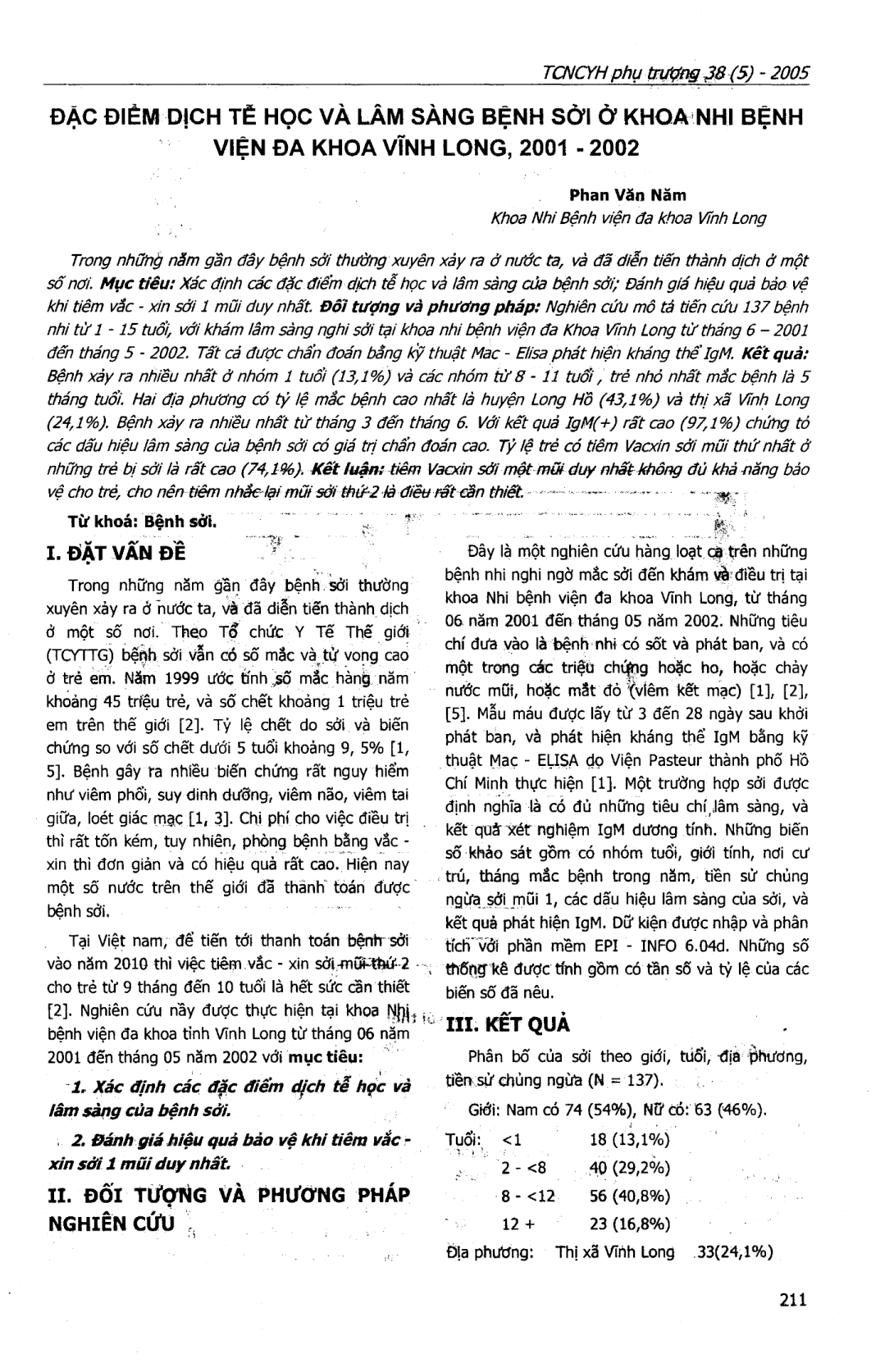 NC mô tả tiến cứu trên 137 bênh nhân là trẻ em từ 1 đến 15 tuổi bị sởi tại BV đa khoa Vĩnh Long từ 6/2001 đến 5/2002. Tất cả BN được chẩn đoán bằng kỹ thuật Mec - Elisa phát hiện kháng thể IgM. Tỷ lệ trẻ em được tiêm vacxin 1 mũi bị sởi lại rất cao (74,!% ). Như vậy, tiêm vacxin 1 mũi duy nhất không đủ khả năng bảo vệ trẻ, do đó cần tiêm nhắclại mũi thứ hai là cần thiết.