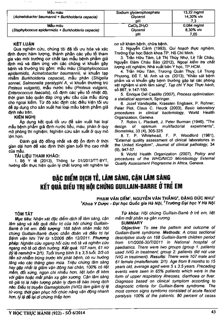 Objective: To see the pattern and outcome of Guillain-Barre syndrome. Methods: A cross sectional descriptive study on 168 Guillain-Barre children period from 1/1/2006 - 30/7/2011 in National hospital of paediatrics. There were two groups (group 1: patients used IVIG in treatment; group 2: patients did not use IVIG in treatment). Results: There were 107 male and 61 female (male/female: 2/1). Age from 8 months to 15 years old, average aged were 5 + or - 3.5 years. Preceding events were seen in 65 percent patients which were in the form of upper respiratory illnesses, diarrhoea or fiver. Diagnosis based on clinical symptom according to diagnostic criteria for Guillain-Barre syndrome. The most comon signs symtoms consisted of acute flaccid paralysis 100 percent of the patients. 80 percent of cases were on feet at the first onset. Cranical nerves were involved only in 2.4 percent. Albuminocytologycal in cerebrospinal fluid was seen 60 percent and 11.3 percent required ventilation. Average long stay in hospital were 11.24 days. Mean duration of ventilation were 31.84 days. There were 126 children in IVIG group, 42 children in without IVIG group. Mean duration recovery in IVIG group were 43.29 days and 76.33 days in without IVIG group. Mean complete recovery duration in both groups were 54.2 days.