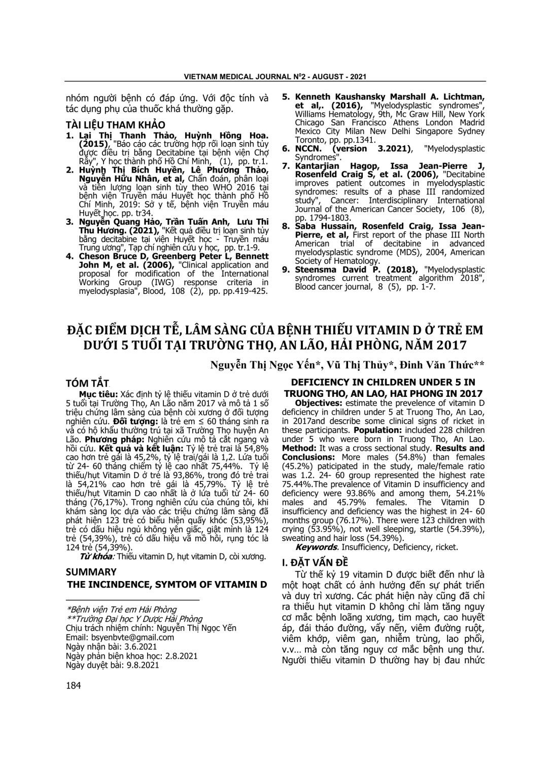 Xác định tỷ lệ thiếu vitamin D ở trẻ dưới 5 tuổi tại Trường Thọ, An Lão năm 2017 và mô tả 1 số triệu chứng lâm sàng của bệnh còi xương ở đối tượng nghiên cứu. Đối tượng: là trẻ em ≤ 60 tháng sinh ra và có hộ khẩu thường trú tại xã Trường Thọ huyện An Lão. Phương pháp: Nghiên cứu mô tả cắt ngang và hồi cứu. Kết quả và kết luận: Tỷ lệ trẻ trai là 54,8% cao hơn trẻ gái là 45,2%, tỷ lệ trai/gái là 1,2. Lứa tuổi từ 24- 60 tháng chiếm tỷ lệ cao nhất 75,44%. Tỷ lệ thiếu/hụt Vitamin D ở trẻ là 93,86%, trong đó trẻ trai là 54,21% cao hơn trẻ gái là 45,79%. Tỷ lệ trẻ thiếu/hụt Vitamin D cao nhất là ở lứa tuổi từ 24- 60 tháng (76,17%). Trong nghiên cứu của chúng tôi, khi khám sàng lọc dựa vào các triệu chứng lâm sàng đã phát hiện 123 trẻ có biểu hiện quấy khóc (53,95%), trẻ có dấu hiệu ngủ không yên giấc, giật mình là 124 trẻ (54,39%), trẻ có dấu hiệu vã mồ hôi, rụng tóc là 124 trẻ (54,39%).