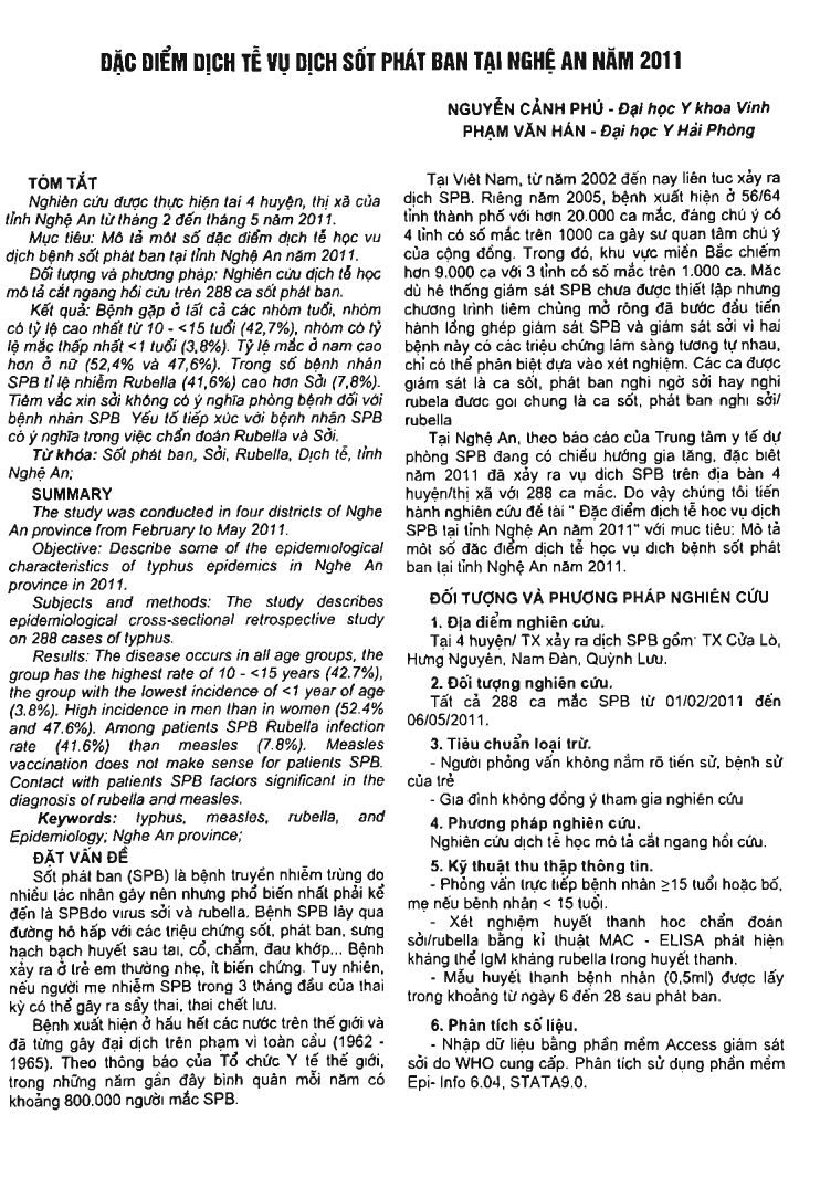 The study was conducted in four districts of Nghe An province from February to May 2011. Objective: Describe some of the epidemiological characteristics of typhus epidemics in Nghe An province in 2011. Subjects and methods: The study describes epidemiological cross-sectional retrospective study on 288 cases of typhus. Results: The disease occurs in all age groups, the group has the highest rate of 10 - 15 years (42.7 percent), the group with the lowest incidence of 1 year of age (3.8 percent). High incidence in men than in women (52.4 percent and 47.6 percent). Among patients SPB Rubella infection rate (41.6 percent) than measles (7.8 percent). Measles vaccination does not make sense for patients SPB. Contact with patients SPB factors significant in the diagnosis of rubella and measles.