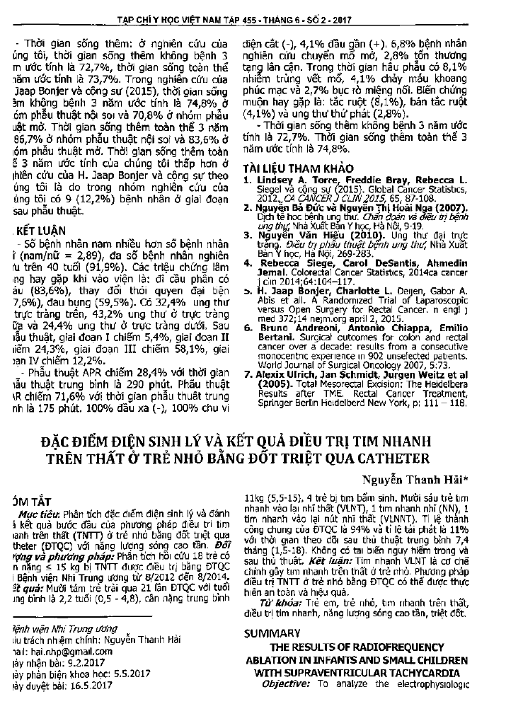 Đặc điểm điện sinh lý và kết quả điều trị tim nhanh trên thất ở 18 trẻ nhỏ bằng đốt triệt qua catheter tại bệnh viện Nhi Trung ương từ 8/2012 đến 8/2014. Kết quả nghiên cứu cho thấy tim nhanh vào lại nhĩ thất là cơ chế chính gây tim nhanh trên thất ở trẻ nhỏ. Phương pháp điều trị tim nhanh trên thất ở trẻ nhỏ bằng đốt triệt qua catheter có thể được thực hiện an toàn và hiệu quả.