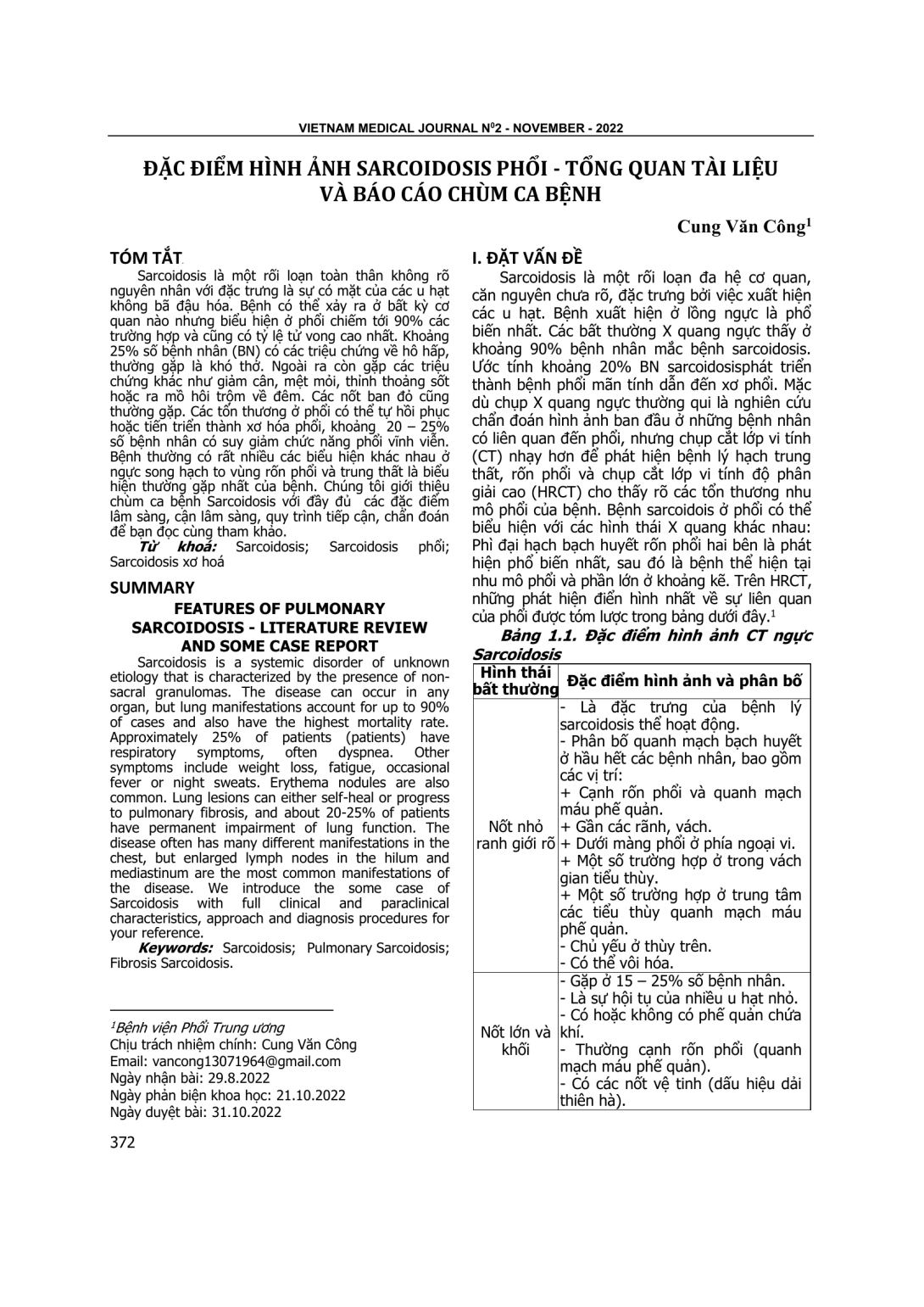 Sarcoidosis is a systemic disorder of unknown etiology that is characterized by the presence of non-sacral granulomas. The disease can occur in any organ, but lung manifestations account for up to 90% of cases and also have the highest mortality rate. Approximately 25% of patients (patients) have respiratory symptoms, often dyspnea. Other symptoms include weight loss, fatigue, occasional fever or night sweats. Erythema nodules are also common. Lung lesions can either self-heal or progress to pulmonary fibrosis, and about 20-25% of patients have permanent impairment of lung function. The disease often has many different manifestations in the chest, but enlarged lymph nodes in the hilum and mediastinum are the most common manifestations of the disease. We introduce the some case of Sarcoidosis with full clinical and paraclinical characteristics, approach and diagnosis procedures for your reference.
