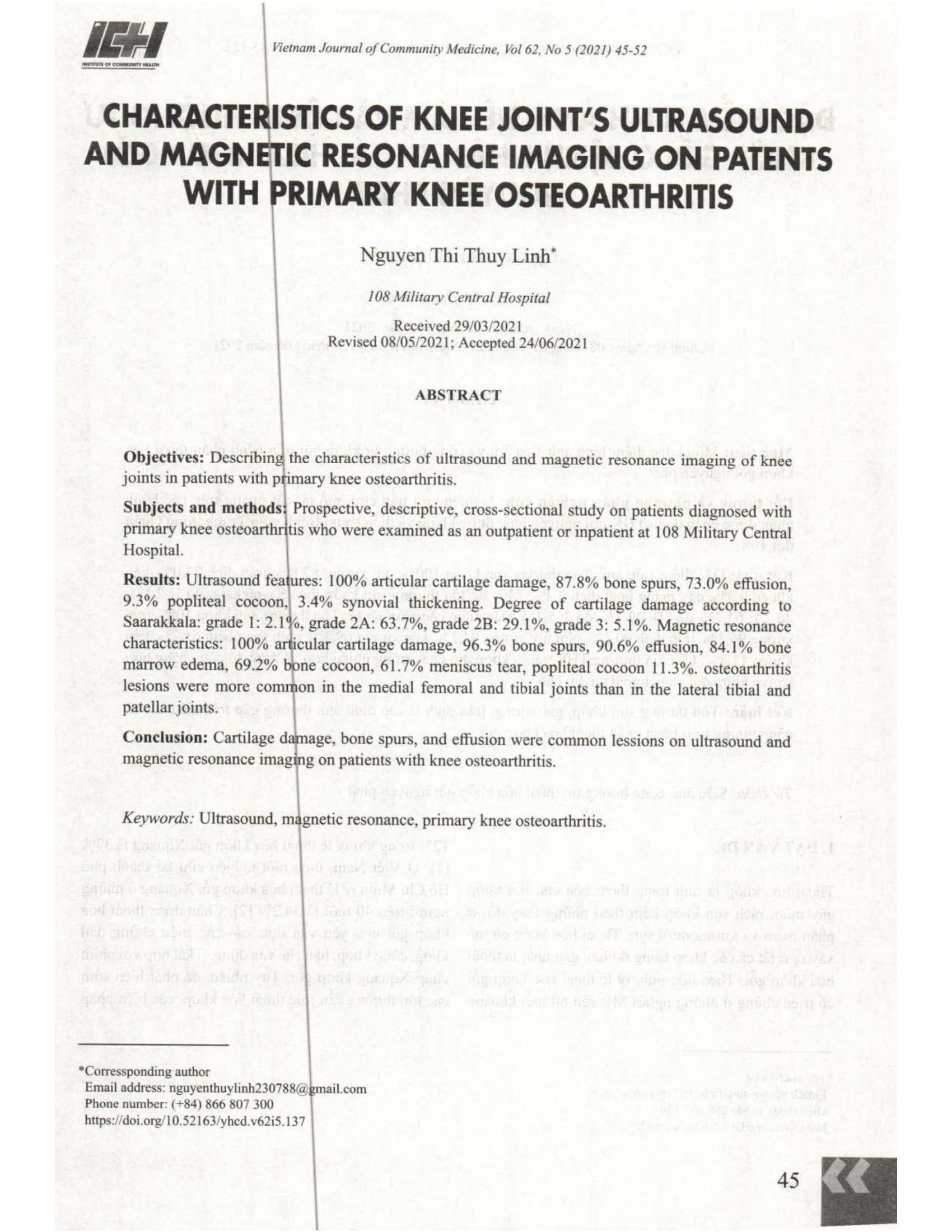 Mô tả đặc điểm hình ảnh siêu âm và cộng hưởng từ khớp gối trên bệnh nhân thoái hóa khớp gối nguyên phát. Đối tượng và phương pháp nghiên cứu: Nghiên cứu tiến cứu, mô tả, cắt ngang trên các bệnh nhân được chẩn đoán THK gối nguyên phát được khám và điều trị tại Bệnh viện Trung ương Quân đội 108. Kết quả: Đặc điểm siêu âm: Tổn thương sụn khớp 100%, gai xương 87,8%, tràn dịch 73,0%, kén khoeo 9,3%, dày màng hoạt dịch 3,4%. Mức độ tổn thương sụn khớp theo Saarakkala: độ 1: 2,1%, độ 2A: 63,7%, độ 2B: 29,1%, độ 3: 5,1%. Đặc điểm cộng hưởng từ: Tổn thương sụn khớp 100%, gai xương 96,3%, tràn dịch 90,6%, phù tủy xương 84,1%, kén xương 69,2%, rách sụn chêm 61,7%, kén khoeo 11,3%. Các tổn thương THK gặp ở khớp đùi chày trong nhiều hơn và mức độ cũng nặng hơn so với khớp đùi chày ngoài và đùi chè. Kết luận: Tổn thương sụn khớp, gai xương, tràn dịch là các hình ảnh thường gặp trên siêu âm và cộng hưởng từ ở bệnh nhân thoái hóa khớp gối.