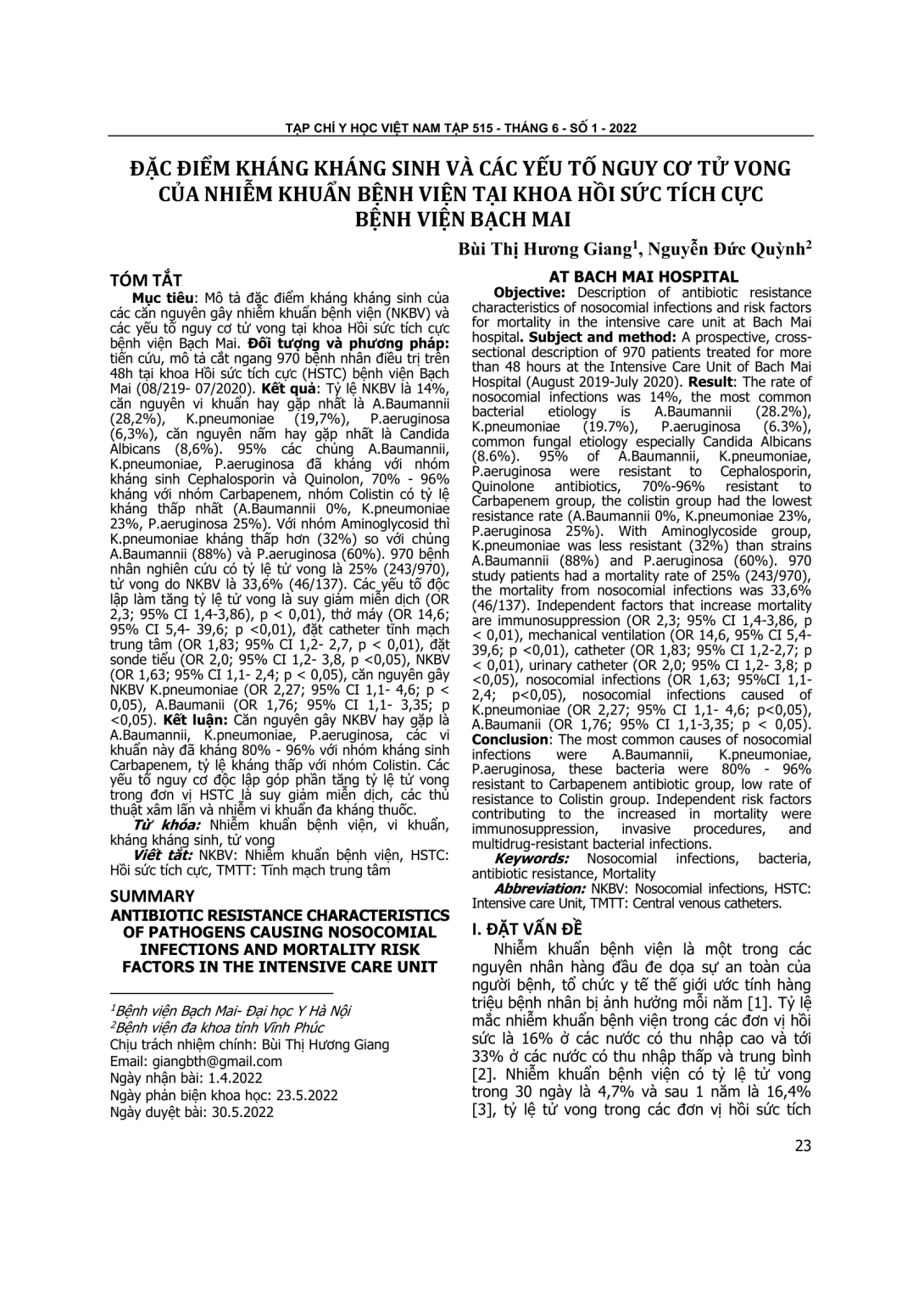 Mô tả đặc điểm kháng kháng sinh của các căn nguyên gây nhiễm khuẩn bệnh viện (NKBV) và các yếu tố nguy cơ tử vong tại khoa Hồi sức tích cực bệnh viện Bạch Mai. Đối tượng và phương pháp: tiến cứu, mô tả cắt ngang 970 bệnh nhân điều trị trên 48h tại khoa Hồi sức tích cực (HSTC) bệnh viện Bạch Mai (08/219- 07/2020). Kết quả: Tỷ lệ NKBV là 14%, căn nguyên vi khuẩn hay gặp nhất là A.Baumannii (28,2%), K.pneumoniae (19,7%), P.aeruginosa (6,3%), căn nguyên nấm hay gặp nhất là Candida Albicans (8,6%). 95% các chủng A.Baumannii, K.pneumoniae, P.aeruginosa đã kháng với nhóm kháng sinh Cephalosporin và Quinolon, 70% - 96% kháng với nhóm Carbapenem, nhóm Colistin có tỷ lệ kháng thấp nhất (A.Baumannii 0%, K.pneumoniae 23%, P.aeruginosa 25%). Với nhóm Aminoglycosid thì K.pneumoniae kháng thấp hơn (32%) so với chủng A.Baumannii (88%) và P.aeruginosa (60%). 970 bệnh nhân nghiên cứu có tỷ lệ tử vong là 25% (243/970), tử vong do NKBV là 33,6% (46/137). Các yếu tố độc lập làm tăng tỷ lệ tử vong là suy giảm miễn dịch (OR 2,3; 95% CI 1,4-3,86), p < 0,01), thở máy (OR 14,6; 95% CI 5,4- 39,6; p <0,01), đặt catheter tĩnh mạch trung tâm (OR 1,83; 95% CI 1,2- 2,7, p < 0,01), đặt sonde tiểu (OR 2,0; 95% CI 1,2- 3,8, p <0,05), NKBV (OR 1,63; 95% CI 1,1- 2,4; p < 0,05), căn nguyên gây NKBV K.pneumoniae (OR 2,27; 95% CI 1,1- 4,6; p < 0,05), A.Baumanii (OR 1,76; 95% CI 1,1- 3,35; p <0,05). Kết luận: Căn nguyên gây NKBV hay gặp là A.Baumannii, K.pneumoniae, P.aeruginosa, các vi khuẩn này đã kháng 80% - 96% với nhóm kháng sinh Carbapenem, tỷ lệ kháng thấp với nhóm Colistin. Các yếu tố nguy cơ độc lập góp phần tăng tỷ lệ tử vong trong đơn vị HSTC là suy giảm miễn dịch, các thủ thuật xâm lấn và nhiễm vi khuẩn đa kháng thuốc.