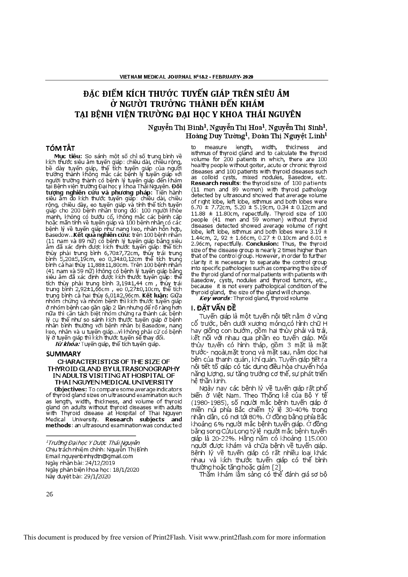 Tiến hành siêu âm đo kích thước tuyến giáp chiều dài, chiều rộng, chiều dày, eo tuyến giáp và tính thể tích tuyến giáp cho 200 bệnh nhân trong đó 100 người khỏe mạnh, không có bướu cổ, không mắc các bệnh cấp hoặc mãn tính về tuyến giáp và 100 bệnh nhân có các bệnh lý về tuyến giáp như nang keo, nhân hỗn hợp, Basedow…Kết quả nghiên cứu trên 100 bệnh nhân (11 nam và 89 nữ) có bệnh lý tuyến giáp bằng siêu âm đã xác định được kích thước tuyến giáp thể tích thùy phải trung bình 6,70±7,72cm, thùy trái trung bình 5,20±5,19cm, eo 0,34±0,12cm thể tích trung bình cả hai thùy 11,88±11,80cm. Trên 100 bệnh nhân (41 nam và 59 nữ) không có bệnh lý tuyến giáp bằng siêu âm đã xác định được kích thước tuyến giáp thể tích thùy phải trung bình 3,19±1,44 cm , thùy trái trung bình 2,92±1,66cm , eo 0,27±0,10cm, thể tích trung bình cả hai thùy 6,01±2,96cm. Kết luận Giữa nhóm chứng và nhóm bệnh thì kích thước tuyến giáp ở nhóm bệnh cao gần gấp 2 lần nhưng để rõ ràng hơn nữa thì cần tách biệt nhóm chứng ra thành các bệnh lý cụ thể như so sánh kích thước tuyến giáp ở bệnh nhân bình thường với bệnh nhân bị Basedow, nang keo, nhân và u tuyến giáp…vì không phải cứ có bệnh lý ở tuyến giáp thì kích thước tuyến sẽ thay đổi.