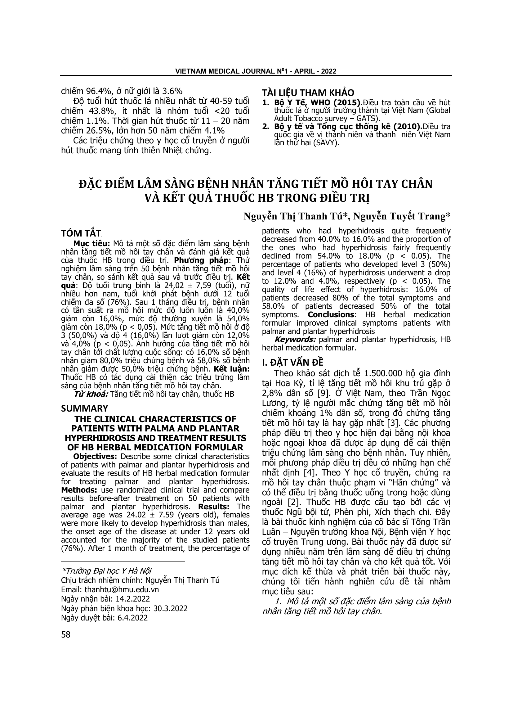 Mô tả một số đặc điểm lâm sàng bệnh nhân tăng tiết mồ hôi tay chân và đánh giá kết quả của thuốc HB trong điều trị. Phương pháp: Thử nghiệm lâm sàng trên 50 bệnh nhân tăng tiết mồ hôi tay chân, so sánh kết quả sau và trước điều trị. Kết quả: Độ tuổi trung bình là 24,02 7,59 (tuổi), nữ nhiều hơn nam, tuổi khởi phát bệnh dưới 12 tuổi chiếm đa số (76%). Sau 1 tháng điều trị, bệnh nhân có tần suất ra mồ hôi mức độ luôn luôn là 40,0% giảm còn 16,0%, mức độ thường xuyên là 54,0% giảm còn 18,0% (p < 0,05). Mức tăng tiết mồ hôi ở độ 3 (50,0%) và độ 4 (16,0%) lần lượt giảm còn 12,0% và 4,0% (p < 0,05). Ảnh hưởng của tăng tiết mồ hôi tay chân tới chất lượng cuộc sống: có 16,0% số bệnh nhân giảm 80,0% triệu chứng bệnh và 58,0% số bệnh nhân giảm được 50,0% triệu chứng bệnh. Kết luận: Thuốc HB có tác dụng cải thiện các triệu trứng lâm sàng của bệnh nhân tăng tiết mồ hôi tay chân.