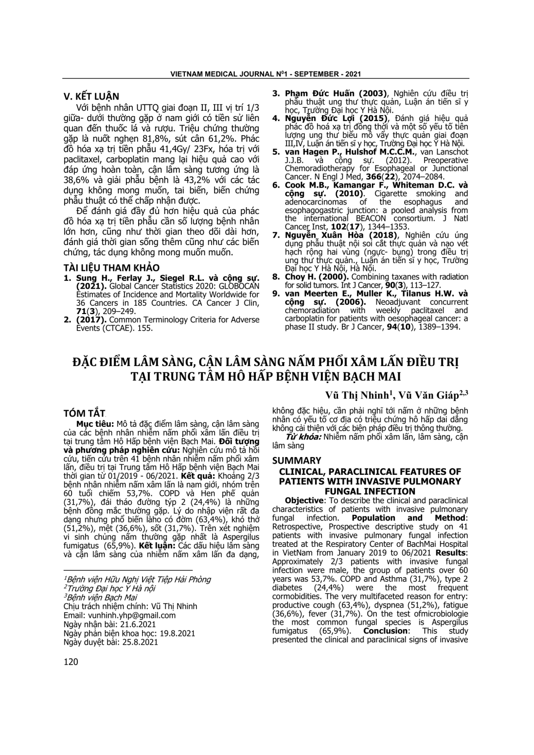 Mô tả đặc điểm lâm sàng, cận lâm sàng của các bệnh nhân nhiễm nấm phổi xâm lấn điều trị tại trung tâm Hô Hấp bệnh viện Bạch Mai. Đối tượng và phương pháp nghiên cứu: Nghiên cứu mô tả hồi cứu, tiến cứu trên 41 bệnh nhân nhiễm nấm phổi xâm lấn, điều trị tại Trung tâm Hô Hấp bệnh viện Bạch Mai thời gian từ 01/2019 - 06/2021. Kết quả: Khoảng 2/3 bệnh nhân nhiễm nấm xâm lấn là nam giới, nhóm trên 60 tuổi chiếm 53,7%. COPD và Hen phế quản (31,7%), đái tháo đường týp 2 (24,4%) là những bệnh đồng mắc thường gặp. Lý do nhập viện rất đa dạng nhưng phổ biến làho có đờm (63,4%), khó thở (51,2%), mệt (36,6%), sốt (31,7%). Trên xét nghiệm vi sinh chủng nấm thường gặp nhất là Aspergilus fumigatus (65,9%). Kết luận: Các dấu hiệu lâm sàng và cận lâm sàng của nhiễm nấm xâm lấn đa dạng, không đặc hiệu, cần phải nghĩ tới nấm ở những bệnh nhân có yếu tố cơ địa có triệu chứng hô hấp dai dẳng không cải thiện với các biện pháp điều trị thông thường