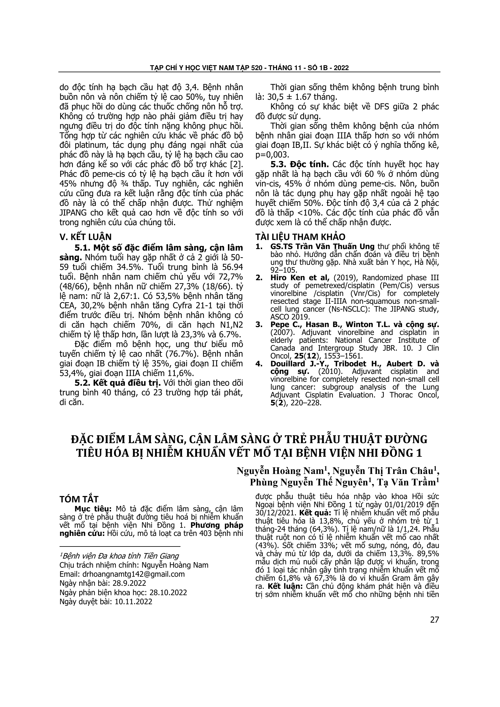 Mô tả đặc điểm lâm sàng, cận lâm sàng ở trẻ phẫu thuật đường tiêu hoá bị nhiễm khuẩn vết mổ tại bệnh viện Nhi Đồng 1. Phương pháp nghiên cứu: Hồi cứu, mô tả loạt ca trên 403 bệnh nhi được phẫu thuật tiêu hóa nhập vào khoa Hồi sức Ngoại bệnh viện Nhi Đồng 1 từ ngày 01/01/2019 đến 30/12/2021. Kết quả: Tỉ lệ nhiễm khuẩn vết mổ phẫu thuật tiêu hóa là 13,8%, chủ yếu ở nhóm trẻ từ 1 tháng-24 tháng (64,3%). Tỉ lệ nam/nữ là 1/1,24. Phẫu thuật ruột non có tỉ lệ nhiễm khuẩn vết mổ cao nhất (43%). Sốt chiếm 33%; vết mổ sưng, nóng, đỏ, đau và chảy mủ từ lớp da, dưới da chiếm 13,3%. 89,5% mẫu dịch mủ nuôi cấy phân lập được vi khuẩn, trong đó 1 loại tác nhân gây tình trạng nhiễm khuẩn vết mổ chiếm 61,8% và 67,3% là do vi khuẩn Gram âm gây ra. Kết luận: Cần chủ động khám phát hiện và điều trị sớm nhiễm khuẩn vết mổ cho những bệnh nhi tiền sử phẫu thuật hệ tiêu hóa; có bệnh lý đi kèm, phẫu thuật ruột non… và khi chưa có kết quả kháng sinh đồ nên sử dụng kháng sinh phối hợp có phổ điều trị cho vi khuẩn Gram âm.