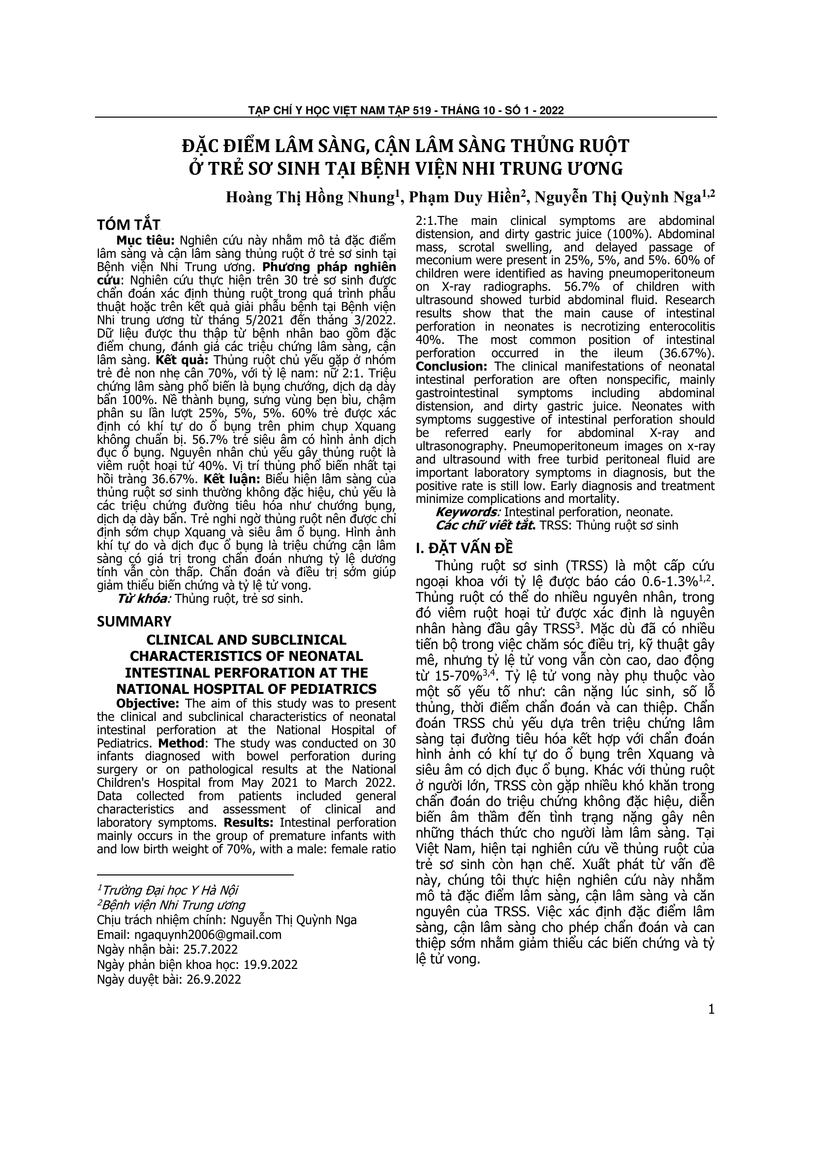 The aim of this study was to present the clinical and subclinical characteristics of neonatal intestinal perforation at the National Hospital of Pediatrics. Method: The study was conducted on 30 infants diagnosed with bowel perforation during surgery or on pathological results at the National Children's Hospital from May 2021 to March 2022. Data collected from patients included general characteristics and assessment of clinical and laboratory symptoms. Intestinal perforation mainly occurs in the group of premature infants with and low birth weight of 70%, with a male: female ratio The aim of this study was to present the clinical and subclinical characteristics of neonatal intestinal perforation at the National Hospital of Pediatrics. The study was conducted on 30 infants diagnosed with bowel perforation during surgery or on pathological results at the National Children's Hospital from May 2021 to March 2022. Data collected from patients included general characteristics and assessment of clinical and laboratory symptoms. Intestinal perforation mainly occurs in the group of premature infants with and low birth weight of 70%, with a male: female ratio