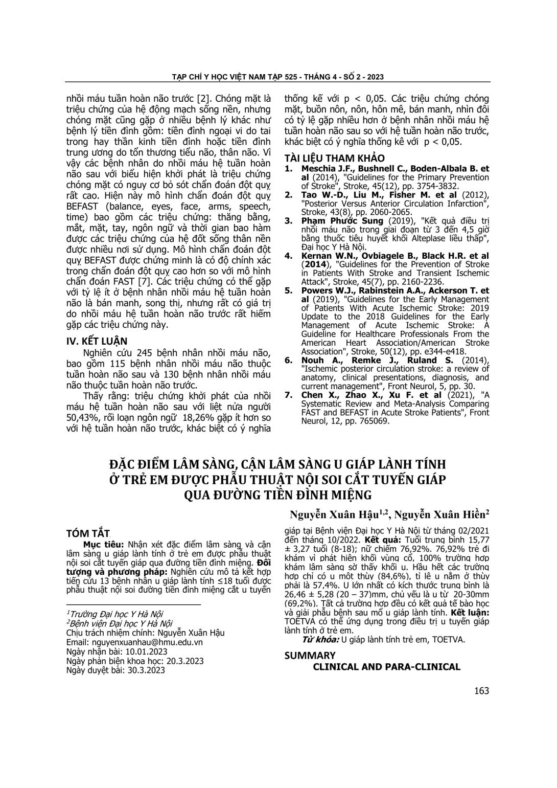 Nhận xét đặc điểm lâm sàng và cận lâm sàng u giáp lành tính ở trẻ em được phẫu thuật nội soi cắt tuyến giáp qua đường tiền đình miệng. Đối tượng và phương pháp: Nghiên cứu mô tả kết hợp tiến cứu 13 bệnh nhân u giáp lành tính ≤18 tuổi được phẫu thuật nội soi đường tiền đình miệng cắt u tuyến giáp tại Bệnh viện Đại học Y Hà Nội từ tháng 02/2021 đến tháng 10/2022. Kết quả: Tuổi trung bình 15,77 ± 3,27 tuổi (8-18); nữ chiếm 76,92%. 76,92% trẻ đi khám vì phát hiện khối vùng cổ, 100% trường hợp khám lâm sàng sờ thấy khối u. Hầu hết các trường hợp chỉ có u một thùy (84,6%), tỉ lệ u nằm ở thùy phải là 57,4%. U lớn nhất có kích thước trung bình là 26,46 ± 5,28 (20 – 37)mm, chủ yếu là u từ 20-30mm (69,2%). Tất cả trường hợp đều có kết quả tế bào học và giải phẫu bệnh sau mổ u giáp lành tính. Kết luận: TOETVA có thể ứng dụng trong điều trị u tuyến giáp lành tính ở trẻ em.