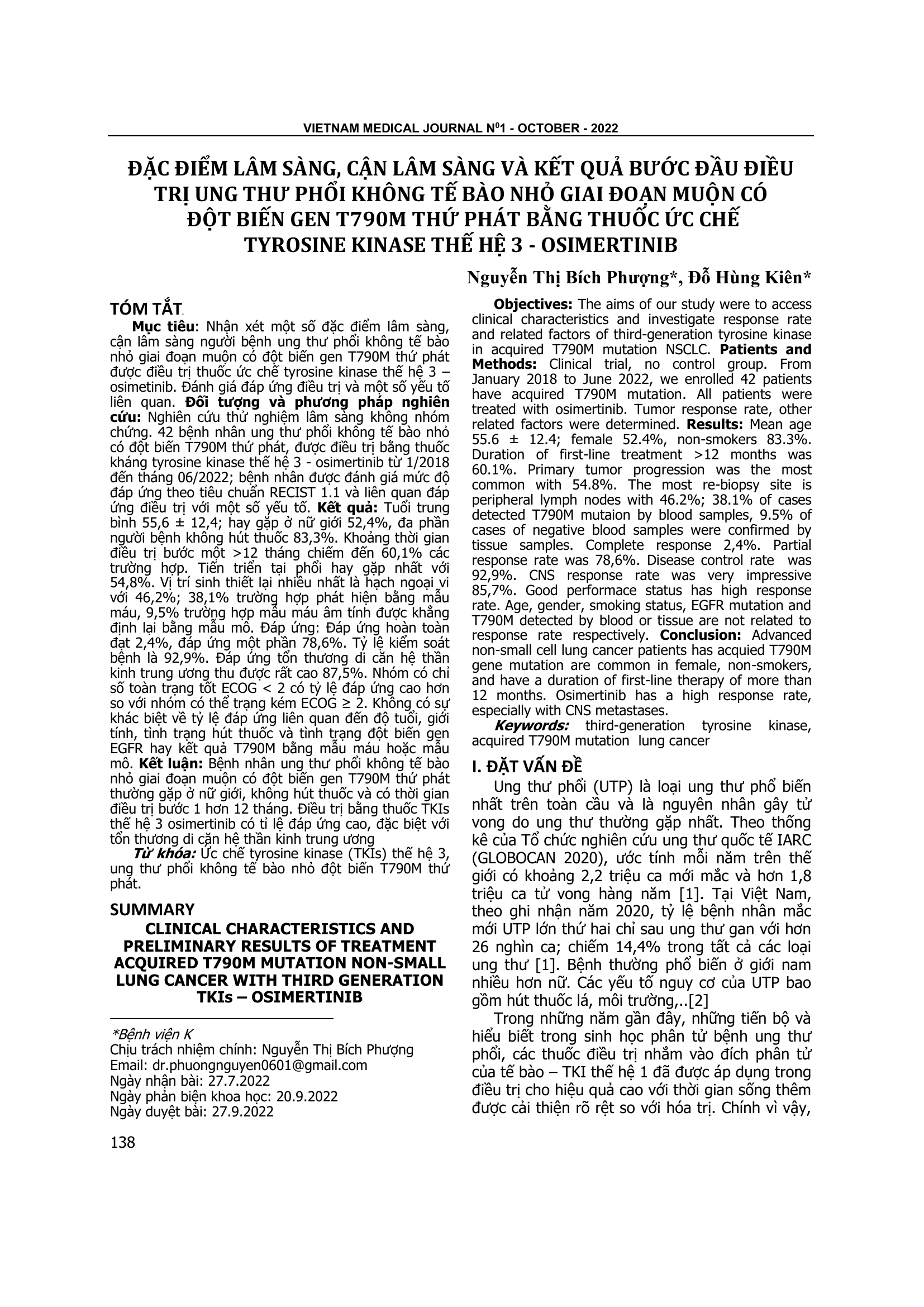 Nhận xét một số đặc điểm lâm sàng, cận lâm sàng người bệnh ung thư phổi không tế bào nhỏ giai đoạn muộn có đột biến gen T790M thứ phát được điều trị thuốc ức chế tyrosine kinase thế hệ 3 – osimetinib. Đánh giá đáp ứng điều trị và một số yếu tố liên quan. Đối tượng và phương pháp nghiên cứu: Nghiên cứu thử nghiệm lâm sàng không nhóm chứng. 42 bệnh nhân ung thư phổi không tế bào nhỏ có đột biến T790M thứ phát, được điều trị bằng thuốc kháng tyrosine kinase thế hệ 3 - osimertinib từ 1/2018 đến tháng 06/2022; bệnh nhân được đánh giá mức độ đáp ứng theo tiêu chuẩn RECIST 1.1 và liên quan đáp ứng điều trị với một số yếu tố. Kết quả: Tuổi trung bình 55,6 ± 12,4; hay gặp ở nữ giới 52,4%, đa phần người bệnh không hút thuốc 83,3%. Khoảng thời gian điều trị bước một >12 tháng chiếm đến 60,1% các trường hợp. Tiến triển tại phổi hay gặp nhất với 54,8%. Vị trí sinh thiết lại nhiều nhất là hạch ngoại vi với 46,2%; 38,1% trường hợp phát hiện bằng mẫu máu, 9,5% trường hợp mẫu máu âm tính được khẳng định lại bằng mẫu mô. Đáp ứng: Đáp ứng hoàn toàn đạt 2,4%, đáp ứng một phần 78,6%. Tỷ lệ kiểm soát bệnh là 92,9%. Đáp ứng tổn thương di căn hệ thần kinh trung ương thu được rất cao 87,5%. Nhóm có chỉ số toàn trạng tốt ECOG < 2 có tỷ lệ đáp ứng cao hơn so với nhóm có thể trạng kém ECOG ≥ 2. Không có sự khác biệt về tỷ lệ đáp ứng liên quan đến độ tuổi, giới tính, tình trạng hút thuốc và tình trạng đột biến gen EGFR hay kết quả T790M bằng mẫu máu hoặc mẫu mô. Kết luận: Bệnh nhân ung thư phổi không tế bào nhỏ giai đoạn muộn có đột biến gen T790M thứ phát thường gặp ở nữ giới, không hút thuốc và có thời gian điều trị bước 1 hơn 12 tháng. Điều trị bằng thuốc TKIs thế hệ 3 osimertinib có tỉ lệ đáp ứng cao, đặc biệt với tổn thương di căn hệ thần kinh trung ương