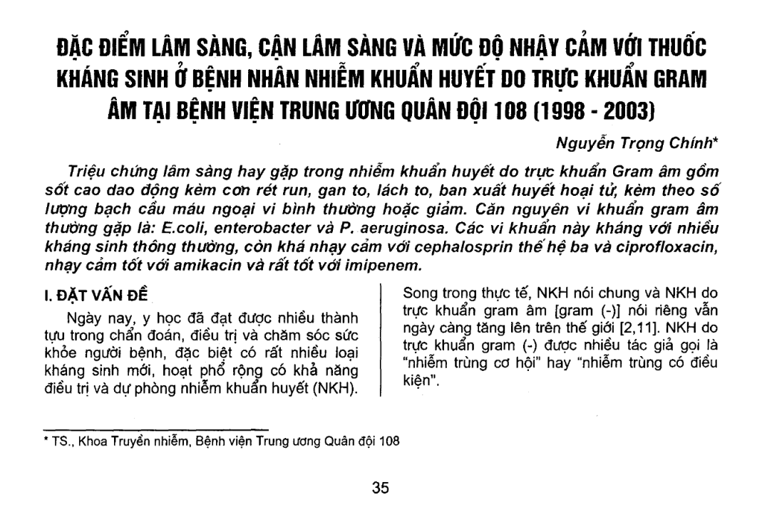 Đặc điểm lâm sàng, cận lâm sàng và mức độ nhạy cảm với thuốc kháng sinh ở bệnh nhân nhiễm khuẩn huyết do trực khuẩn gram âm tại bệnh viện trung ương quân đội 108 (1998-2003)