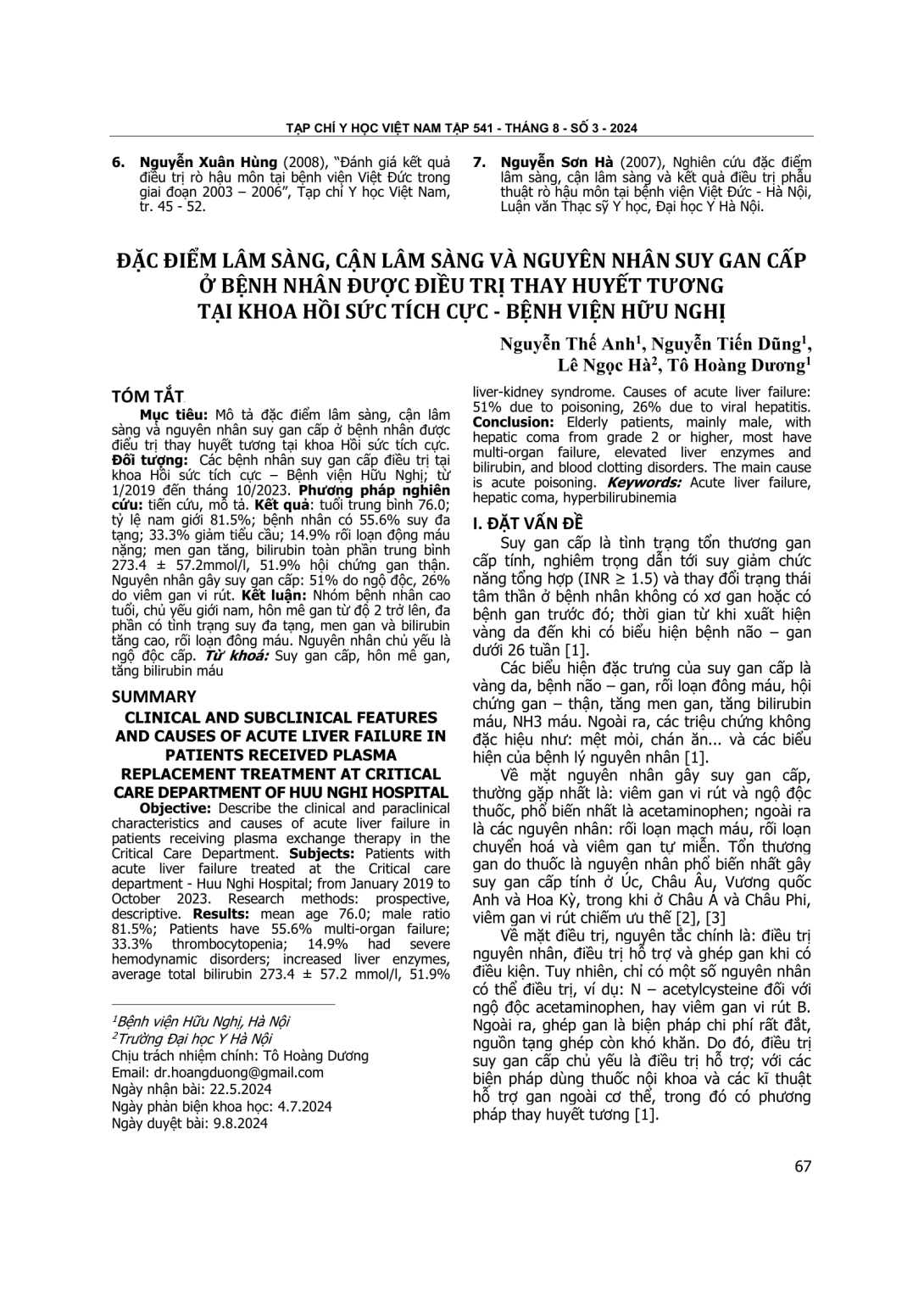 Mô tả đặc điểm lâm sàng, cận lâm sàng và nguyên nhân suy gan cấp ở bệnh nhân được điểu trị thay huyết tương tại khoa Hồi sức tích cực. Đối tượng: Các bệnh nhân suy gan cấp điều trị tại khoa Hồi sức tích cực – Bệnh viện Hữu Nghị; từ 1/2019 đến tháng 10/2023. Phương pháp nghiên cứu: tiến cứu, mô tả. Kết quả: tuổi trung bình 76.0; tỷ lệ nam giới 81.5%; bệnh nhân có 55.6% suy đa tạng; 33.3% giảm tiểu cầu; 14.9% rối loạn động máu nặng; men gan tăng, bilirubin toàn phần trung bình 273.4 ± 57.2mmol/l, 51.9% hội chứng gan thận. Nguyên nhân gây suy gan cấp: 51% do ngộ độc, 26% do viêm gan vi rút. Kết luận: Nhóm bệnh nhân cao tuổi, chủ yếu giới nam, hôn mê gan từ độ 2 trở lên, đa phần có tình trạng suy đa tạng, men gan và bilirubin tăng cao, rối loạn đông máu. Nguyên nhân chủ yếu là ngộ độc cấp.