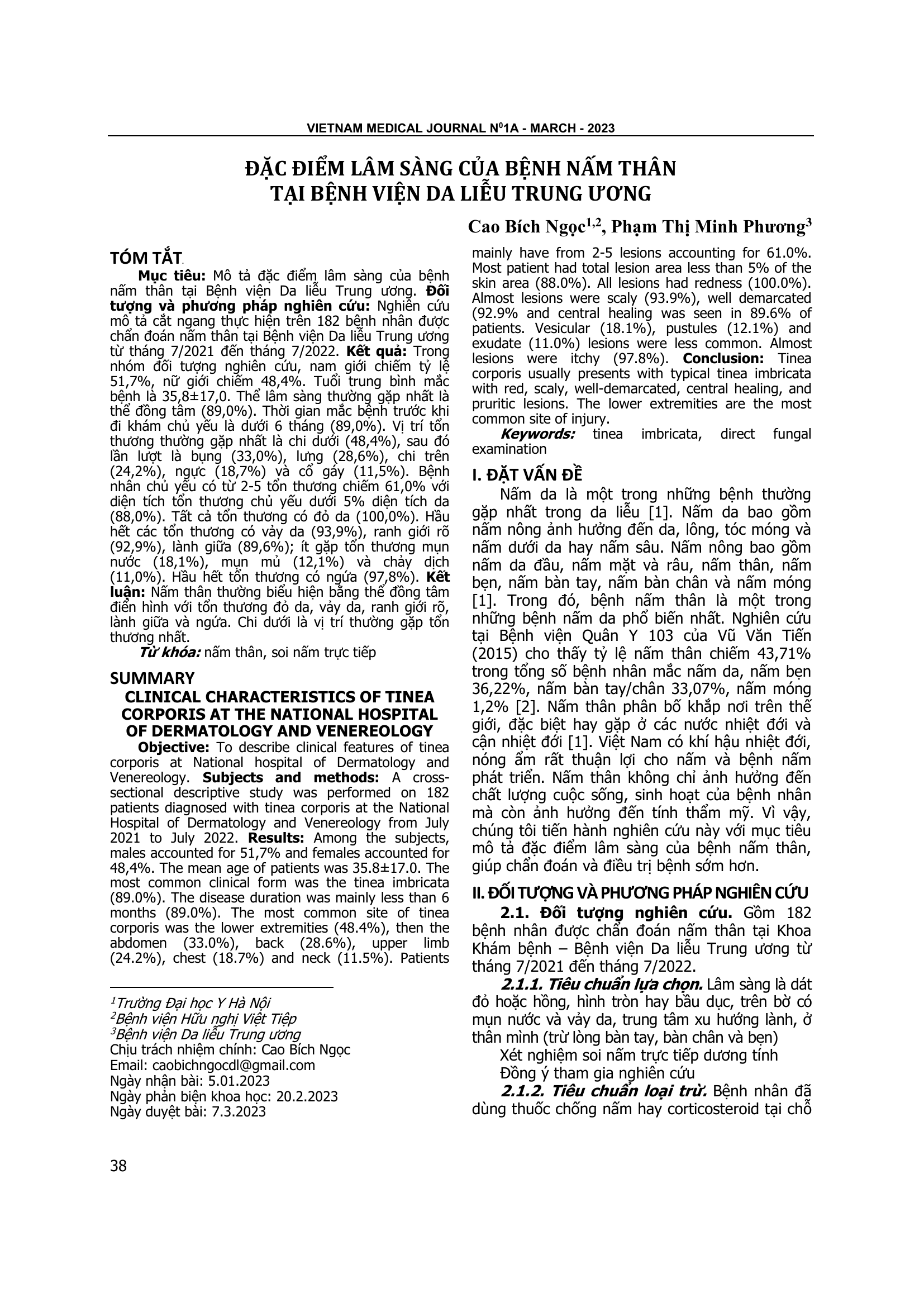 Mô tả đặc điểm lâm sàng của bệnh nấm thân tại Bệnh viện Da liễu Trung ương. Đối tượng và phương pháp nghiên cứu: Nghiên cứu mô tả cắt ngang thực hiện trên 182 bệnh nhân được chẩn đoán nấm thân tại Bệnh viện Da liễu Trung ương từ tháng 7/2021 đến tháng 7/2022. Kết quả: Trong nhóm đối tượng nghiên cứu, nam giới chiếm tỷ lệ 51,7%, nữ giới chiếm 48,4%. Tuổi trung bình mắc bệnh là 35,8±17,0. Thể lâm sàng thường gặp nhất là thể đồng tâm (89,0%). Thời gian mắc bệnh trước khi đi khám chủ yếu là dưới 6 tháng (89,0%). Vị trí tổn thương thường gặp nhất là chi dưới (48,4%), sau đó lần lượt là bụng (33,0%), lưng (28,6%), chi trên (24,2%), ngực (18,7%) và cổ gáy (11,5%). Bệnh nhân chủ yếu có từ 2-5 tổn thương chiếm 61,0% với diện tích tổn thương chủ yếu dưới 5% diện tích da (88,0%). Tất cả tổn thương có đỏ da (100,0%). Hầu hết các tổn thương có vảy da (93,9%), ranh giới rõ (92,9%), lành giữa (89,6%); ít gặp tổn thương mụn nước (18,1%), mụn mủ (12,1%) và chảy dịch (11,0%). Hầu hết tổn thương có ngứa (97,8%). Kết luận: Nấm thân thường biểu hiện bằng thể đồng tâm điển hình với tổn thương đỏ da, vảy da, ranh giới rõ, lành giữa và ngứa. Chi dưới là vị trí thường gặp tổn thương nhất.