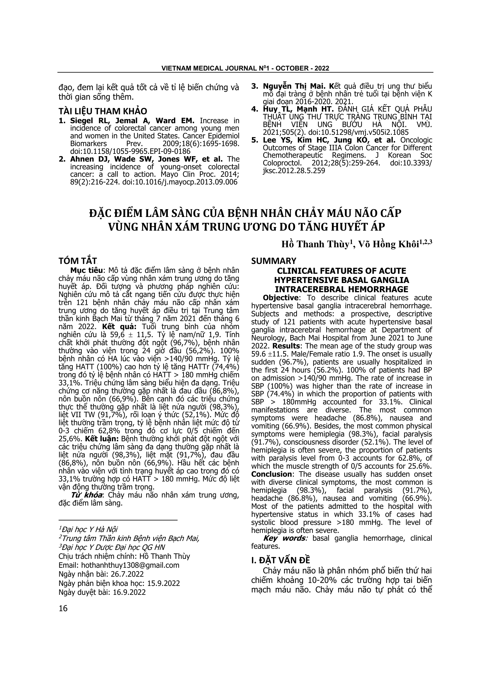 Mô tả đặc điểm lâm sàng ở bệnh nhân chảy máu não cấp vùng nhân xám trung ương do tăng huyết áp. Đối tượng và phương pháp nghiên cứu: Nghiên cứu mô tả cắt ngang tiến cứu được thực hiện trên 121 bệnh nhân chảy máu não cấp nhân xám trung ương do tăng huyết áp điều trị tại Trung tâm thần kinh Bạch Mai từ tháng 7 năm 2021 đến tháng 6 năm 2022. Kết quả: Tuổi trung bình của nhóm nghiên cứu là 59,6 11,5. Tỷ lệ nam/nữ 1,9. Tính chất khởi phát thường đột ngột (96,7%), bệnh nhân thường vào viện trong 24 giờ đầu (56,2%). 100% bệnh nhân có HA lúc vào viện >140/90 mmHg. Tỷ lệ tăng HATT (100%) cao hơn tỷ lệ tăng HATTr (74,4%) trong đó tỷ lệ bệnh nhân có HATT > 180 mmHg chiếm 33,1%. Triệu chứng lâm sàng biểu hiện đa dạng. Triệu chứng cơ năng thường gặp nhất là đau đầu (86,8%), nôn buồn nôn (66,9%). Bên cạnh đó các triệu chứng thực thể thường gặp nhất là liệt nửa người (98,3%), liệt VII TW (91,7%), rối loạn ý thức (52,1%). Mức độ liệt thường trầm trọng, tỷ lệ bệnh nhân liệt mức độ từ 0-3 chiếm 62,8% trong đó cơ lực 0/5 chiếm đến 25,6%. Kết luận: Bệnh thường khởi phát đột ngột với các triệu chứng lâm sàng đa dạng thường gặp nhất là liệt nửa người (98,3%), liệt mặt (91,7%), đau đầu (86,8%), nôn buồn nôn (66,9%). Hầu hết các bệnh nhân vào viện với tình trạng huyết áp cao trong đó có 33,1% trường hợp có HATT > 180 mmHg. Mức độ liệt vận động thường trầm trọng.