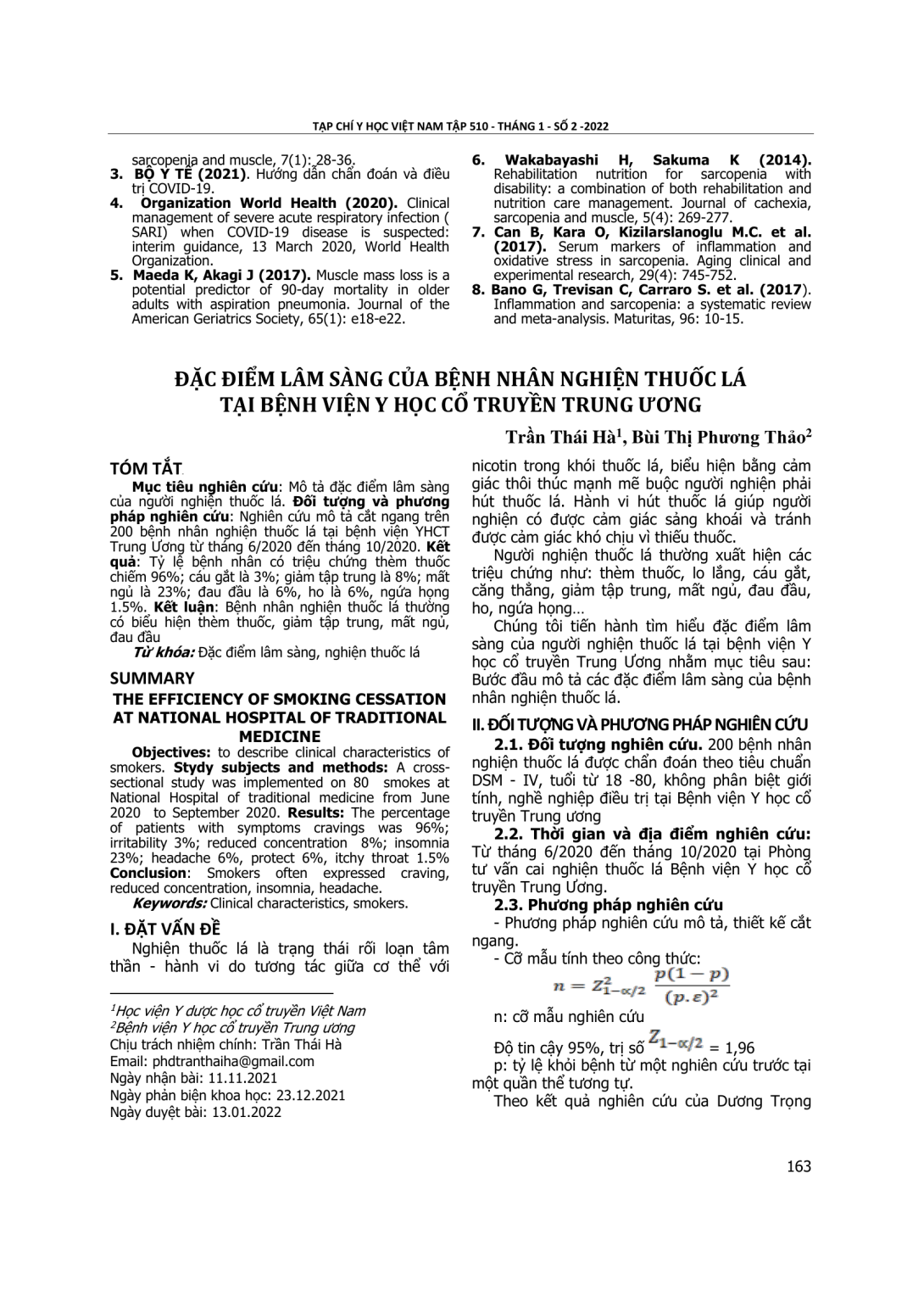 Mô tả đặc điểm lâm sàng của người nghiện thuốc lá. Đối tượng và phương pháp nghiên cứu: Nghiên cứu mô tả cắt ngang trên 200 bệnh nhân nghiện thuốc lá tại bệnh viện YHCT Trung Ương từ tháng 6/2020 đến tháng 10/2020. Kết quả: Tỷ lệ bệnh nhân có triệu chứng thèm thuốc chiếm 96%; cáu gắt là 3%; giảm tập trung là 8%; mất ngủ là 23%; đau đầu là 6%, ho là 6%, ngứa họng 1.5%. Kết luận: Bệnh nhân nghiện thuốc lá thường có biểu hiện thèm thuốc, giảm tập trung, mất ngủ, đau đầu