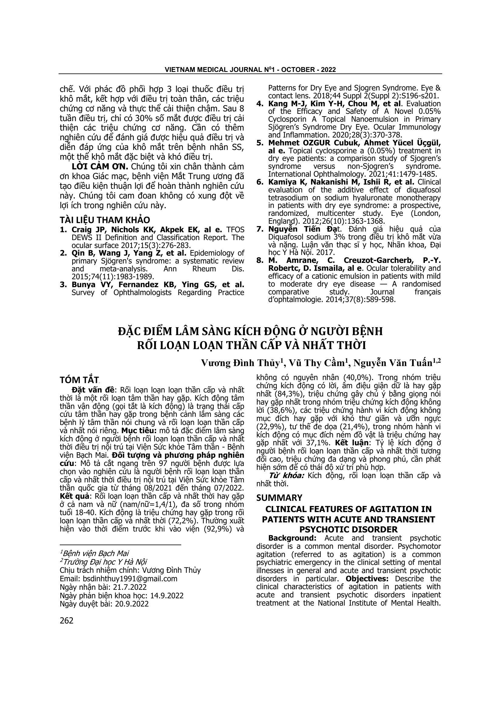Rối loạn loạn loạn thần cấp và nhất thời là một rối loạn tâm thần hay gặp. Kích động tâm thần vận động (gọi tắt là kích động) là trạng thái cấp cứu tâm thần hay gặp trong bệnh cảnh lâm sàng các bệnh lý tâm thần nói chung và rối loạn loạn thần cấp và nhất nói riêng. Mục tiêu: mô tả đặc điểm lâm sàng kích động ở người bệnh rối loạn loạn thần cấp và nhất thời điều trị nội trú tại Viện Sức khỏe Tâm thần - Bệnh viện Bạch Mai. Đối tượng và phương pháp nghiên cứu: Mô tả cắt ngang trên 97 người bệnh được lựa chọn vào nghiên cứu là người bệnh rối loạn loạn thần cấp và nhất thời điều trị nội trú tại Viện Sức khỏe Tâm thần quốc gia từ tháng 08/2021 đến tháng 07/2022. Kết quả: Rối loạn loạn thần cấp và nhất thời hay gặp ở cả nam và nữ (nam/nữ=1,4/1), đa số trong nhóm tuổi 18-40. Kích động là triệu chứng hay gặp trong rối loạn loạn thần cấp và nhất thời (72,2%). Thường xuất hiện vào thời điểm trước khi vào viện (92,9%) và không có nguyên nhân (40,0%). Trong nhóm triệu chứng kích động có lời, âm điệu giận dữ là hay gặp nhất (84,3%), triệu chứng gây chú ý bằng giọng nói hay gặp nhất trong nhóm triệu chứng kích động không lời (38,6%), các triệu chứng hành vi kích động không mục đích hay gặp với khó thư giãn và ưỡn ngực (22,9%), tư thế đe dọa (21,4%), trong nhóm hành vi kích động có mục đích ném đồ vật là triệu chứng hay gặp nhất với 37,1%. Kết luận: Tỷ lệ kích động ở người bệnh rối loạn loạn thần cấp và nhất thời tương đối cao, triệu chứng đa dạng và phong phú, cần phát hiện sớm để có thái độ xử trí phù hợp.