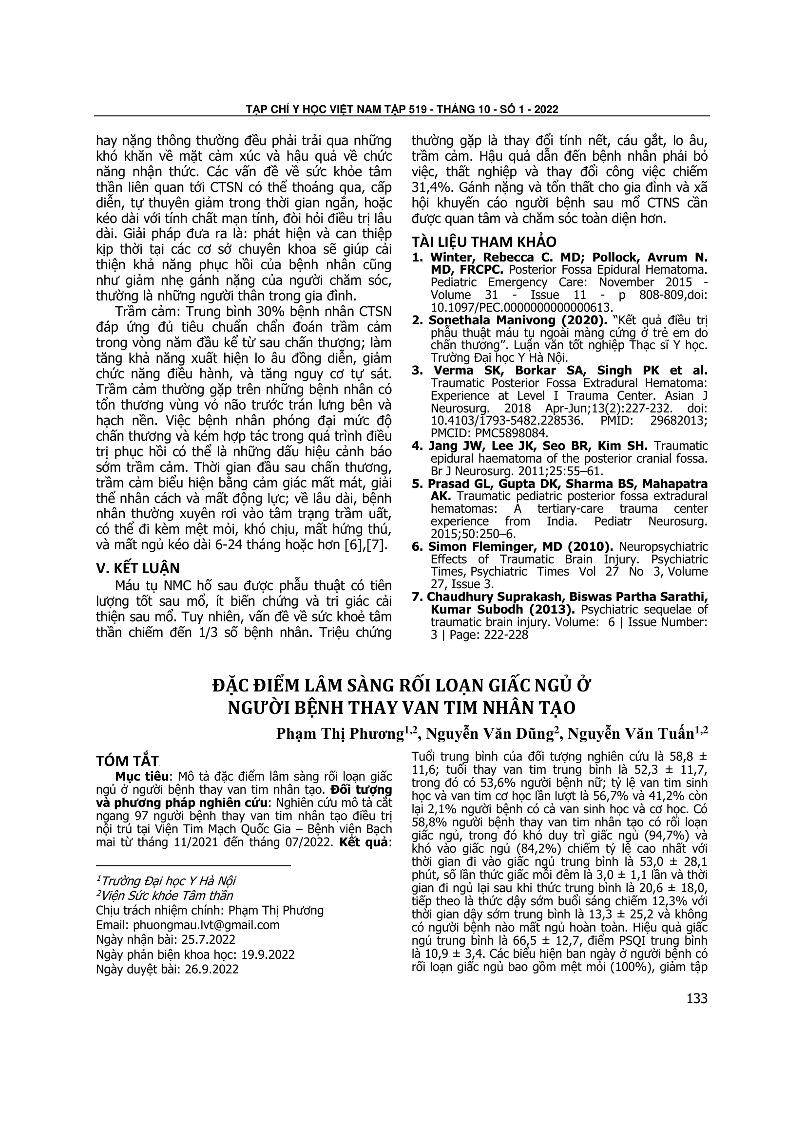 Mô tả đặc điểm lâm sàng rối loạn giấc ngủ ở người bệnh thay van tim nhân tạo. Đối tượng và phương pháp nghiên cứu: Nghiên cứu mô tả cắt ngang 97 người bệnh thay van tim nhân tạo điều trị nội trú tại Viện Tim Mạch Quốc Gia – Bệnh viện Bạch mai từ tháng 11/2021 đến tháng 07/2022. uổi trung bình của đối tượng nghiên cứu là 58,8 ± 11,6; tuổi thay van tim trung bình là 52,3 ± 11,7, trong đó có 53,6% người bệnh nữ; tỷ lệ van tim sinh học và van tim cơ học lần lượt là 56,7% và 41,2% còn lại 2,1% người bệnh có cả van sinh học và cơ học. Có 58,8% người bệnh thay van tim nhân tạo có rối loạn giấc ngủ, trong đó khó duy trì giấc ngủ (94,7%) và khó vào giấc ngủ (84,2%) chiếm tỷ lệ cao nhất với thời gian đi vào giấc ngủ trung bình là 53,0 ± 28,1 phút, số lần thức giấc mỗi đêm là 3,0 ± 1,1 lần và thời gian đi ngủ lại sau khi thức trung bình là 20,6 ± 18,0, tiếp theo là thức dậy sớm buổi sáng chiếm 12,3% với thời gian dậy sớm trung bình là 13,3 ± 25,2 và không có người bệnh nào mất ngủ hoàn toàn. Hiệu quả giấc ngủ trung bình là 66,5 ± 12,7, điểm PSQI trung bình là 10,9 ± 3,4. Các biểu hiện ban ngày ở người bệnh có rối loạn giấc ngủ bao gồm mệt mỏi (100%), giảm tập trung (59,7%), căng thẳng, nhức đầu (29,8%), bồn chồn (28,1%), buồn ngủ quá mức (19,3%), chóng mặt (19,3%), run (12,3%). Kết luận: Rối loạn giấc ngủ là thường gặp ở người bệnh thay van tim nhân tạo, khó vào giấc ngủ và khó duy trì giấc ngủ là đặc điểm lâm sàng phổ biến. Các biểu hiện ban ngày là thường gặp và gây nhiều ảnh hưởng đến chất lượng cuộc sống ở người bệnh thay van tim nhân tạo.