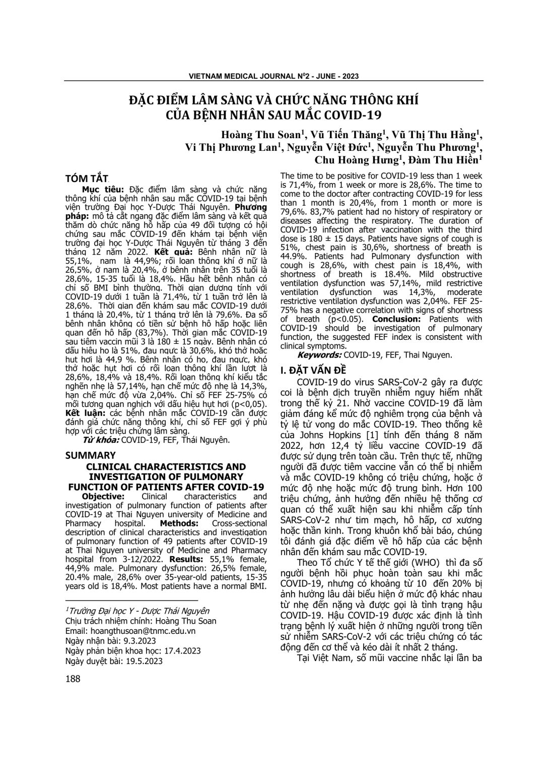 Clinical characteristics and investigation of pulmonary function of patients after COVID-19 at Thai Nguyen university of Medicine and Pharmacy hospital. Methods: Cross-sectional description of clinical characteristics and investigation of pulmonary function of 49 patients after COVID-19 at Thai Nguyen university of Medicine and Pharmacy hospital from 3-12/2022. Results: 55,1% female, 44,9% male. Pulmonary dysfunction: 26,5% female, 20.4% male, 28,6% over 35-year-old patients, 15-35 years old is 18,4%. Most patients have a normal BMI. The time to be positive for COVID-19 less than 1 week is 71,4%, from 1 week or more is 28,6%. The time to come to the doctor after contracting COVID-19 for less than 1 month is 20,4%, from 1 month or more is 79,6%. 83,7% patient had no history of respiratory or diseases affecting the respiratory. The duration of COVID-19 infection after vaccination with the third dose is 180 ± 15 days. Patients have signs of cough is 51%, chest pain is 30,6%, shortness of breath is 44.9%. Patients had Pulmonary dysfunction with cough is 28,6%, with chest pain is 18,4%, with shortness of breath is 18.4%. Mild obstructive ventilation dysfunction was 57,14%, mild restrictive ventilation dysfunction was 14,3%, moderate restrictive ventilation dysfunction was 2,04%. FEF 25-75% has a negative correlation with signs of shortness of breath (p<0.05). Conclusion: Patients with COVID-19 should be investigation of pulmonary function, the suggested FEF index is consistent with clinical symptoms.