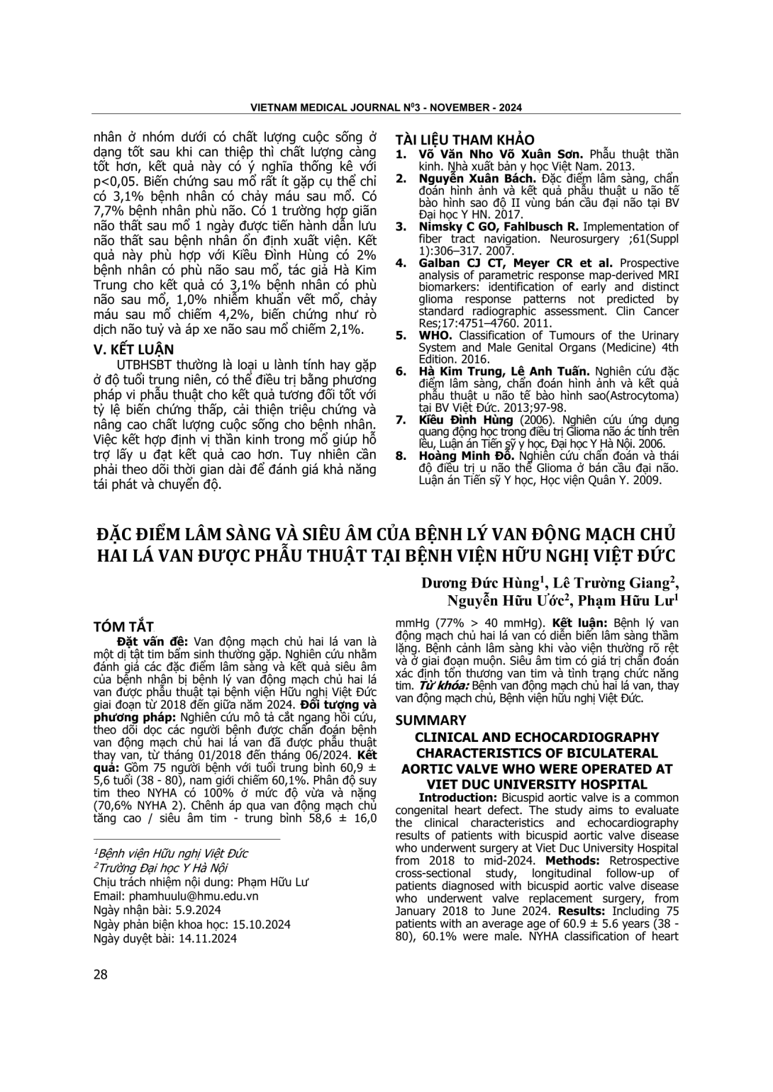 Van động mạch chủ hai lá van là một dị tật tim bẩm sinh thường gặp. Nghiên cứu nhằm đánh giá các đặc điểm lâm sàng và kết quả siêu âm của bệnh nhân bị bệnh lý van động mạch chủ hai lá van được phẫu thuật tại bệnh viện Hữu nghị Việt Đức giai đoạn từ 2018 đến giữa năm 2024. Đối tượng và phương pháp: Nghiên cứu mô tả cắt ngang hồi cứu, theo dõi dọc các người bệnh được chẩn đoán bệnh van động mạch chủ hai lá van đã được phẫu thuật thay van, từ tháng 01/2018 đến tháng 06/2024. Kết quả: Gồm 75 người bệnh với tuổi trung bình 60,9 ± 5,6 tuổi (38 - 80), nam giới chiếm 60,1%. Phân độ suy tim theo NYHA có 100% ở mức độ vừa và nặng (70,6% NYHA 2). Chênh áp qua van động mạch chủ tăng cao / siêu âm tim - trung bình 58,6 ± 16,0 mmHg (77% > 40 mmHg). Kết luận: Bệnh lý van động mạch chủ hai lá van có diễn biến lâm sàng thầm lặng. Bệnh cảnh lâm sàng khi vào viện thường rõ rệt và ở giai đoạn muộn. Siêu âm tim có giá trị chẩn đoán xác định tổn thương van tim và tình trạng chức năng tim.