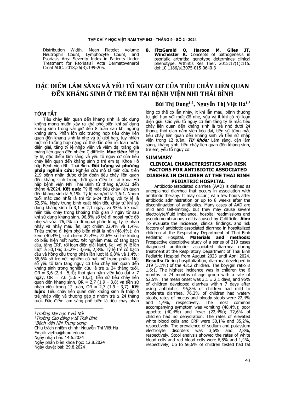 To evaluate the incidence, clinical findings, and risk factors of antibiotic-associated diarrhea in hospitalized children at the Respiratory Department of Thai Binh Pediatric Hospital. Materials and methods: Prospective descriptive study of a series of 219 cases diagnosed antibiotic- associated diarrhea during treatment at the Respiratory Department of Thai Binh Pediatric Hospital from August 2023 until April 2024. Results: During hospitalization, diarrhea developed in 219 (5,1%) of the 4312 children. The boy/girl ratio is 1,6:1. The highest incidence was in children the 6 months to 24 months of age group with a rate of 52,5%. The mean onset was 3,1 ± 2,1 days, and 95% of children developed diarrhea within 7 days after using antibiotics. 96,8% of children had mild to moderate diarrhea. 76,2% of children had watery stools, rates of mucus and bloody stools were 22,4% and 1,4%, respectively. The most common accompanying symptom was vomiting (48,4%); poor appetite (40,4%) and fever (22,4%); 72,6% of children had no dehydration. The rates of elevated white blood cells and CRP were 50,1% and 35,2%, respectively. The prevalence of sodium and potassium electrolyte disorders was 3,6% and 2,8%, respectively. Stool analysis showed the rates of white blood cells and red blood cells were 6,8% and 1,4%, respectively; Up to 56,6% of children tested had fat particles in their stools. Some risk factors in the study include children ≤ 24 months, OR = 3,6 (2,4 – 5,4); long hospital stay more than 7 days, OR = 7,6 (5,6 – 10,3); history of antibiotic-associated diarrhea, OR = 2,7 (1,9 - 3,8), and history of hospitalization within the prior 12 weeks, OR = 2,7 (1,9 - 3,7). Conclusion: The incidence of AAD is low among hospitalized children and common in children ≤ 24 months of age. Most of diarrheal episodes are mild to moderate severity and self-limiting. Risk factors of antibiotic-associated diarrhea are infants ≤ 24 months of age, prolonged hospital stay, history of ADD, and history of hospitalization within the prior 12 weeks.